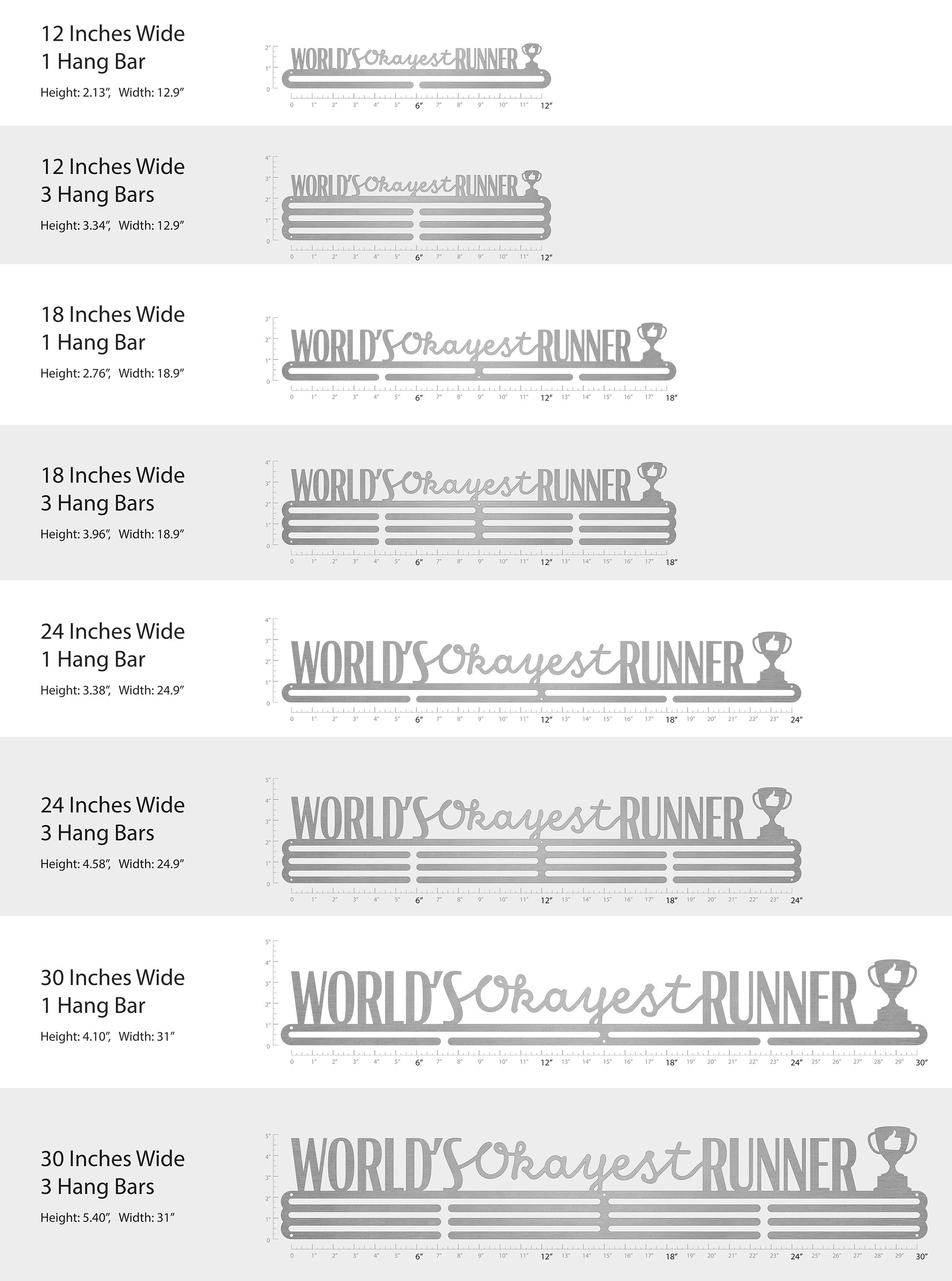 Unsure what size to get? We have created two consistently scaled images to show you what different sized displays look like when filled with medals.