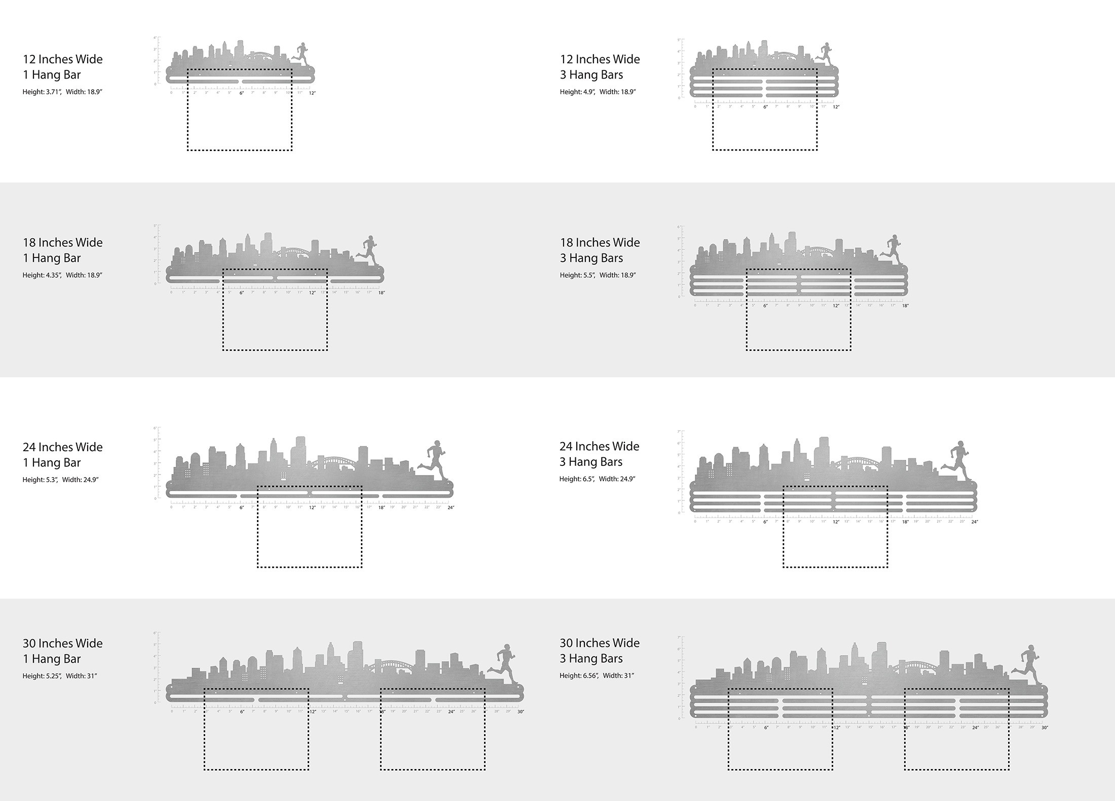 Unsure what size to get? We have created two consistently scaled images to show you what different sized displays look like when filled with medals.