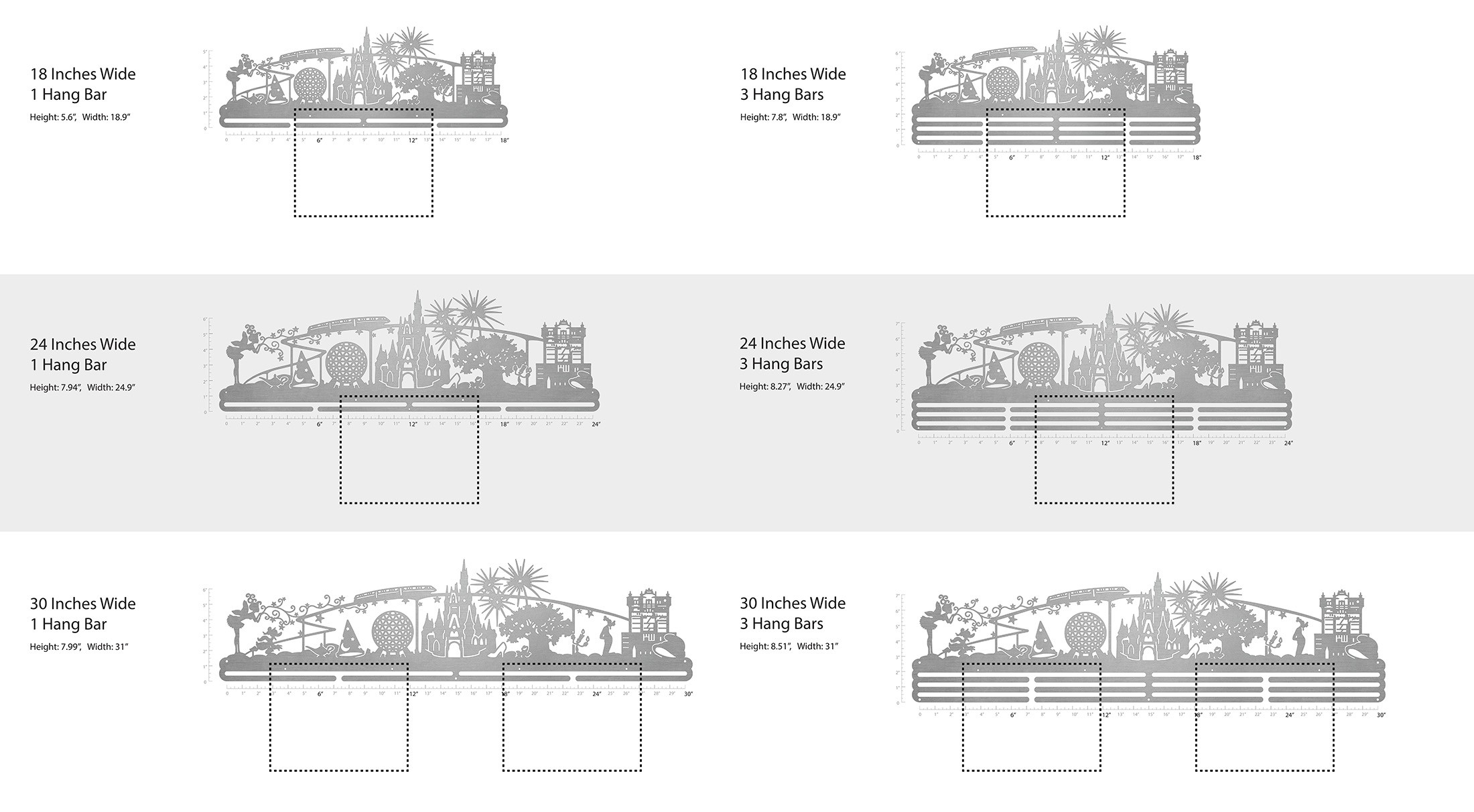 Unsure what size to get? We have created two consistently scaled images to show you what different sized displays look like when filled with medals.