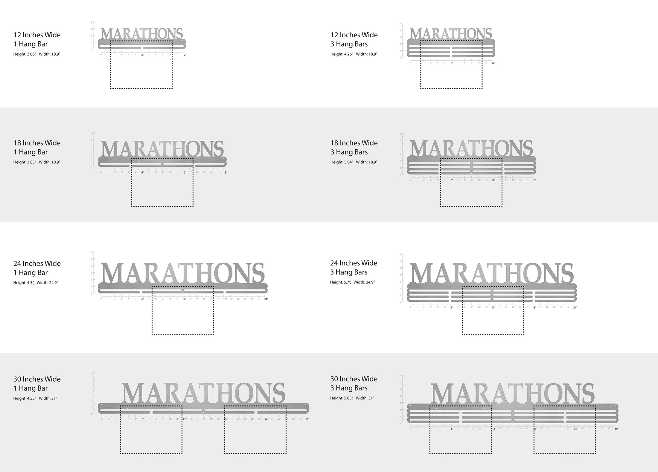 Unsure what size to get? We have created two consistently scaled images to show you what different sized displays look like when filled with medals.
