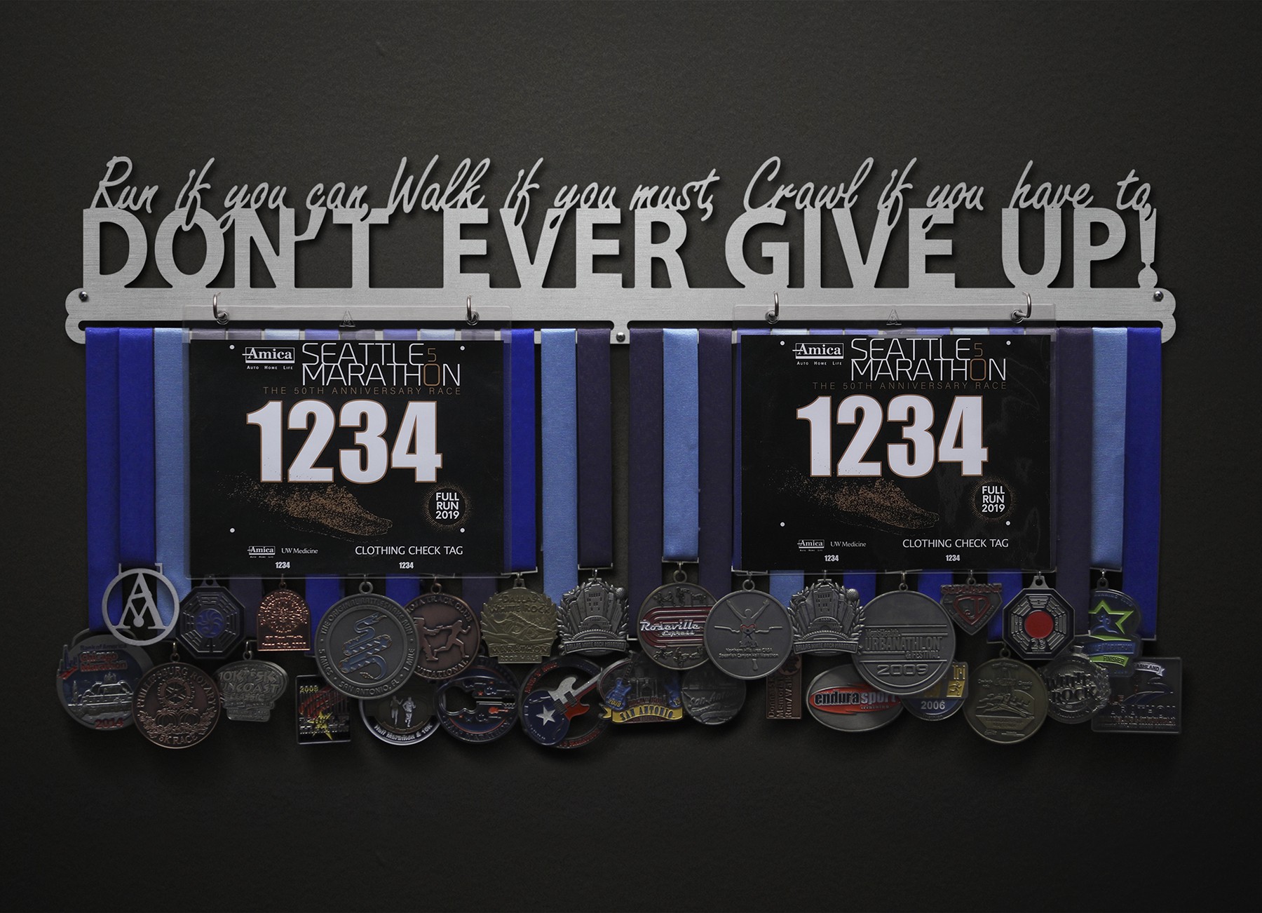 Run, Walk, Crawl - Don't Ever Give Up! Bib and Medal Display