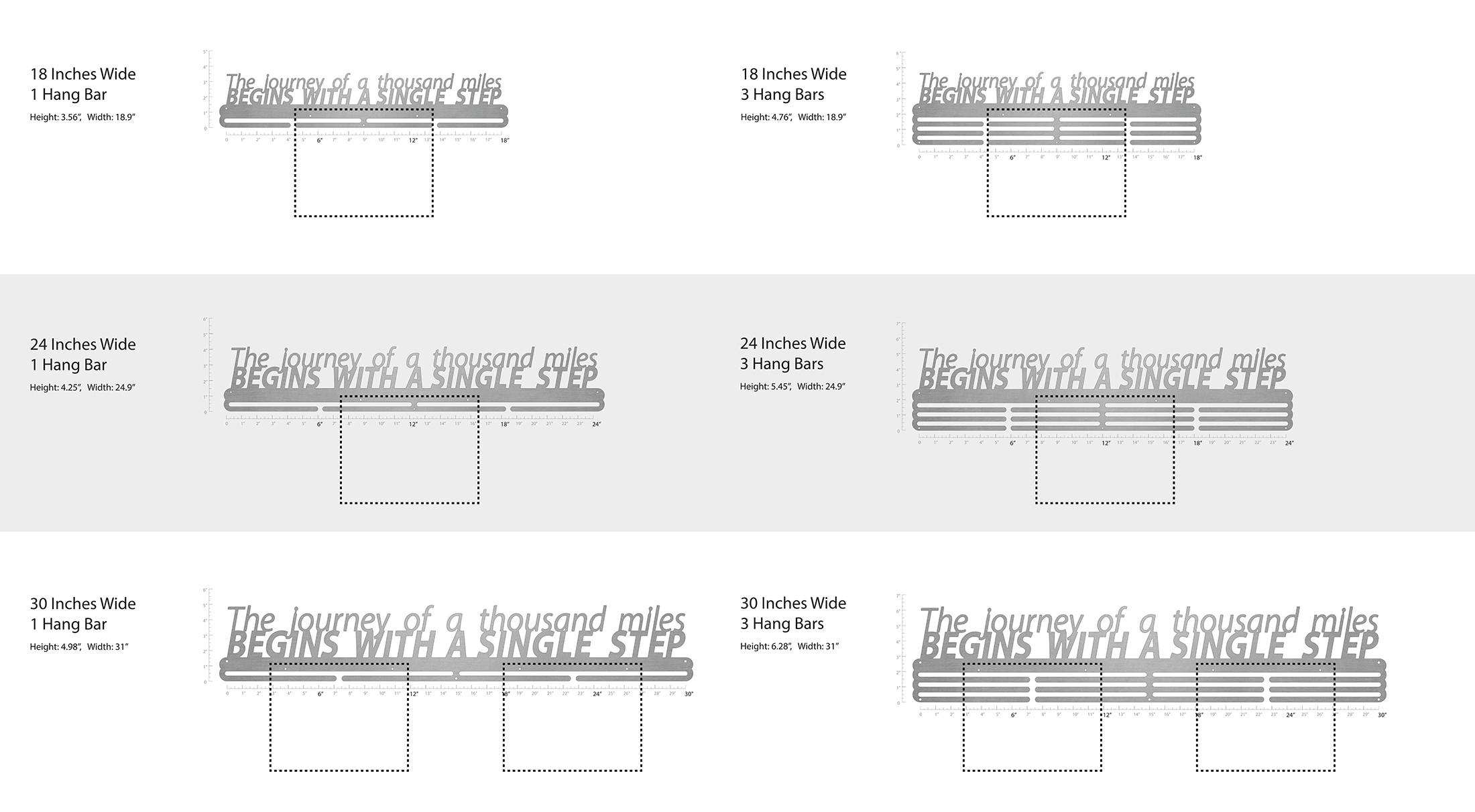 Unsure what size to get? We have created two consistently scaled images to show you what different sized displays look like when filled with medals.
