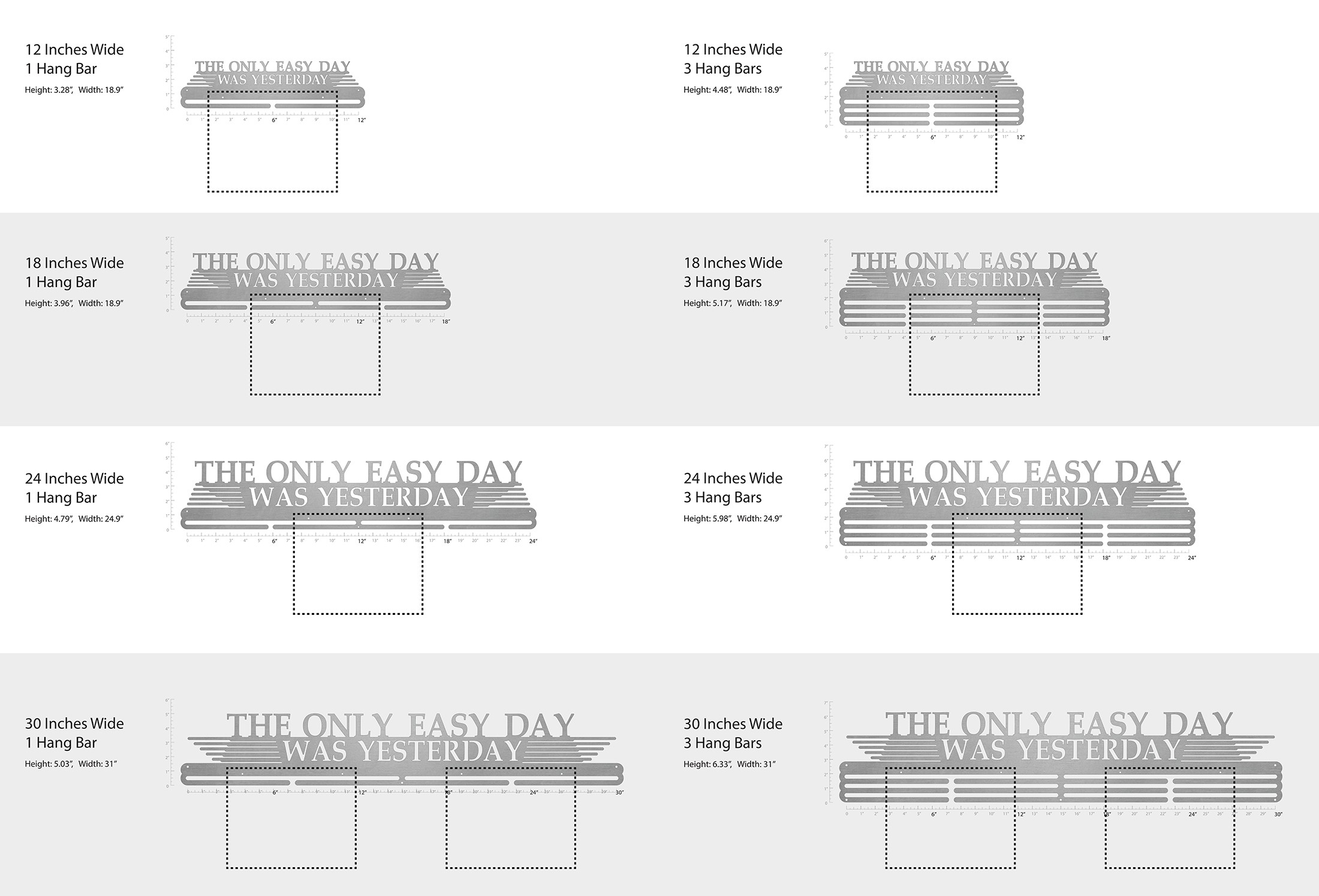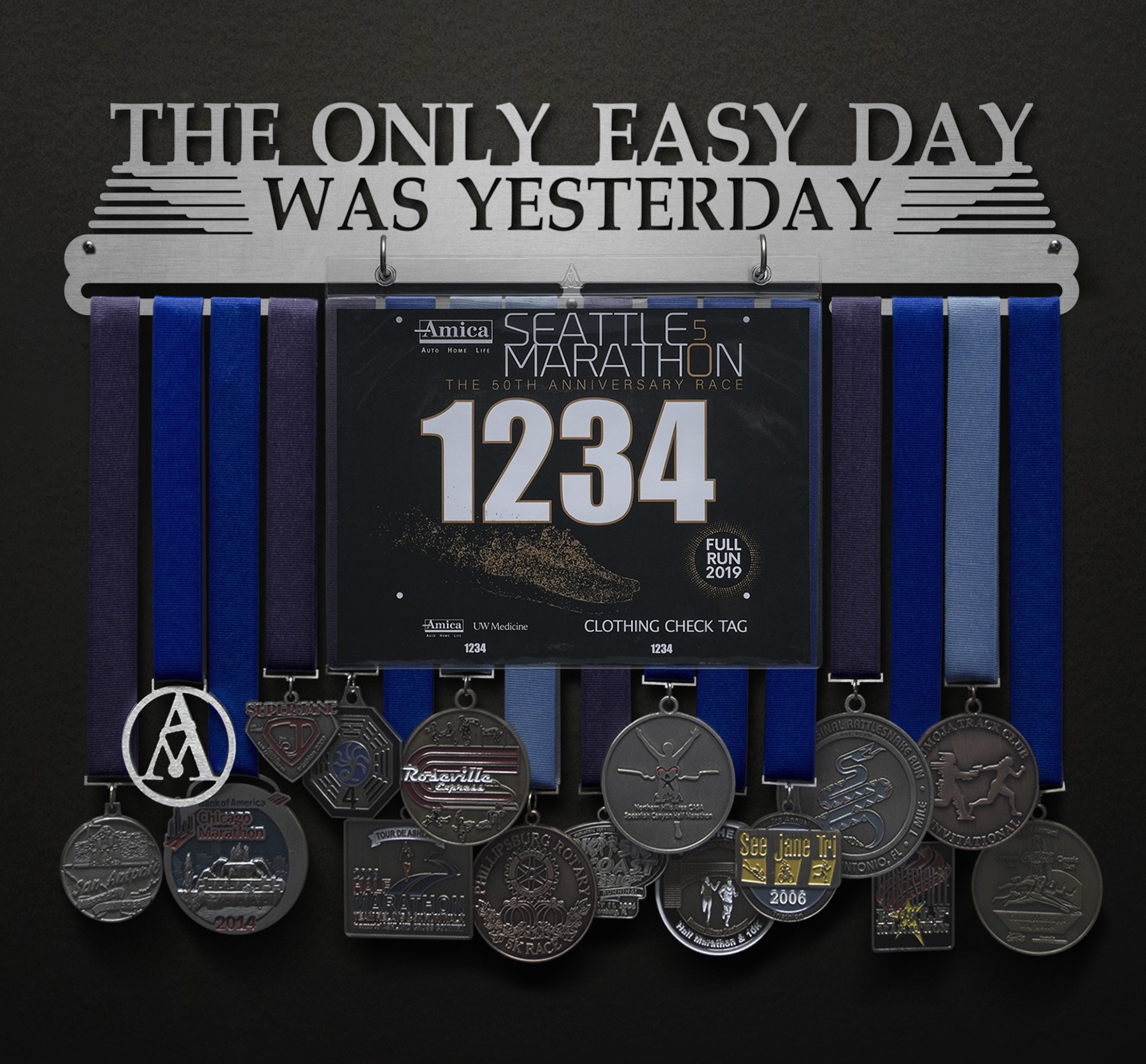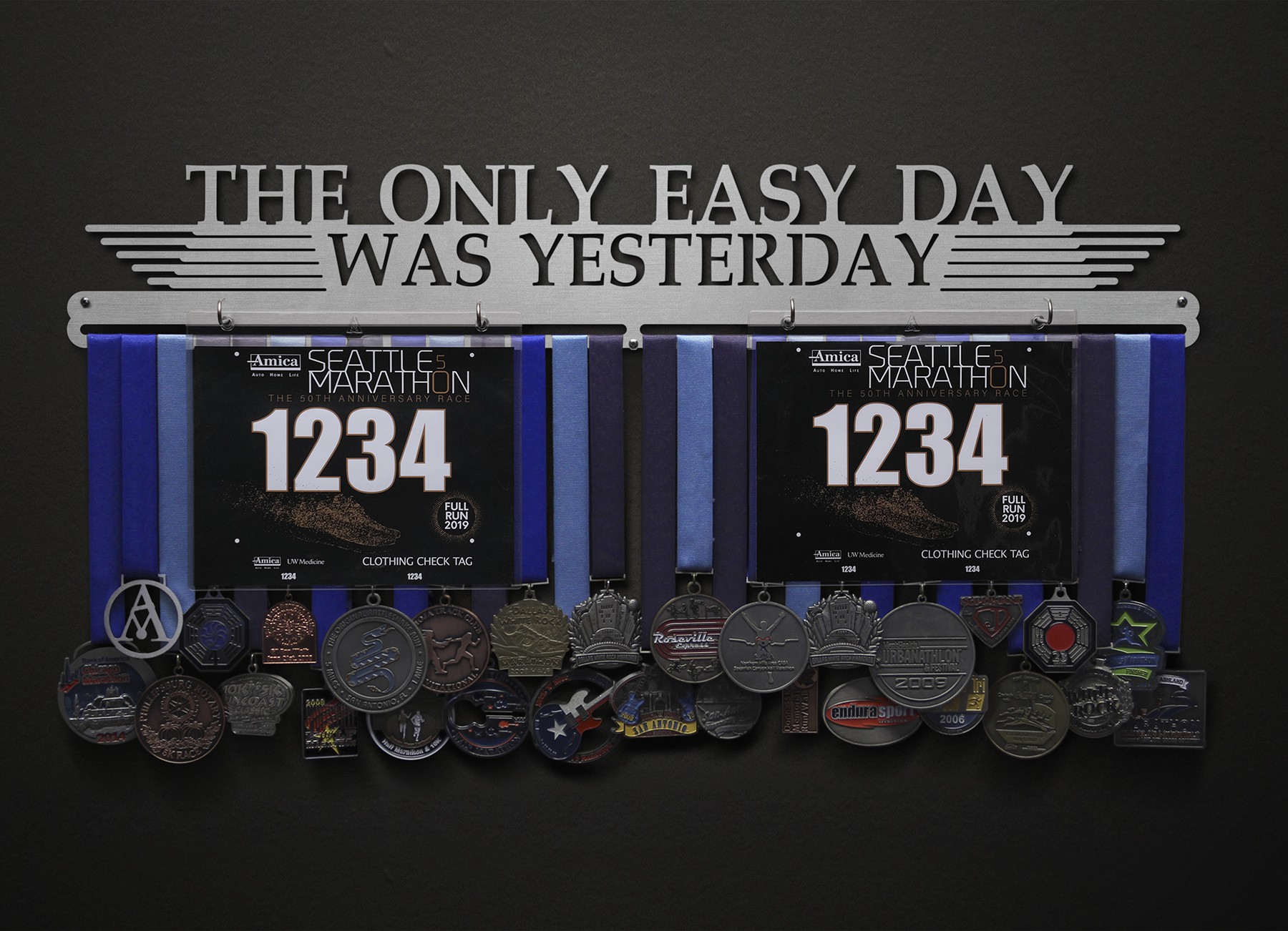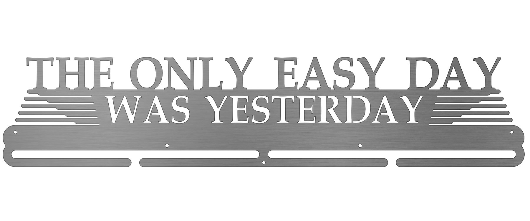 An inspirational quote used by the most elite fighting force in the U.S. Navy, the Navy Seals. Not only do you work harder each day than the day before; what you do today makes yesterday look easy. Showcase yesterday's victories with this medal hanger, and then make them look easy as you take on increasingly difficult challenges today.
