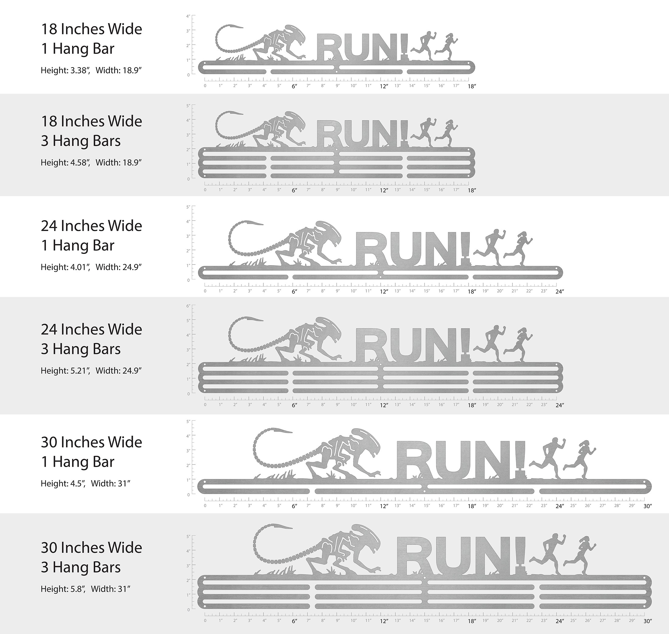 Unsure what size to get? We have created two consistently scaled images to show you what different sized displays look like when filled with medals.