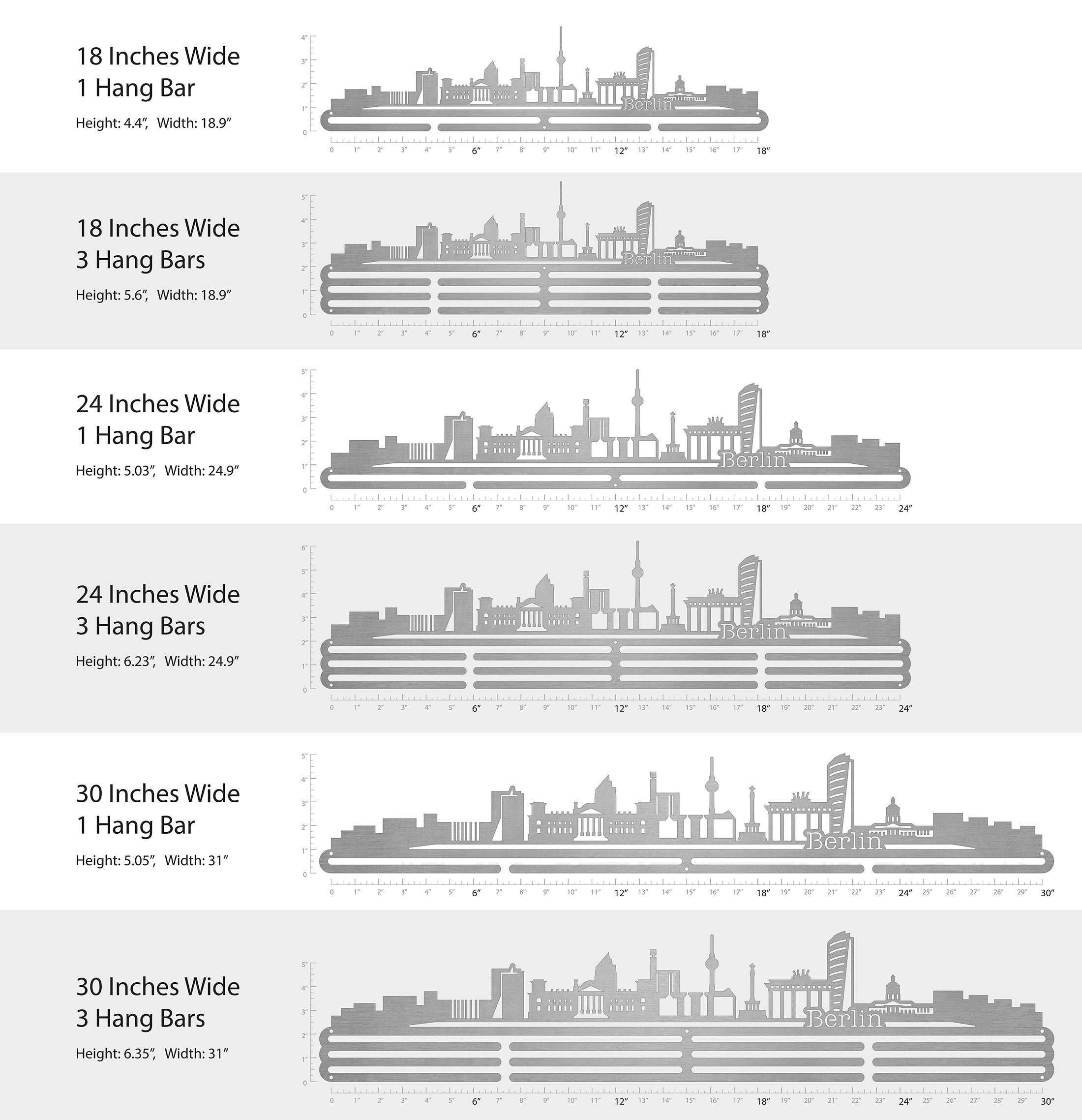 Unsure what size to get? We have created two consistently scaled images to show you what different sized displays look like when filled with medals.