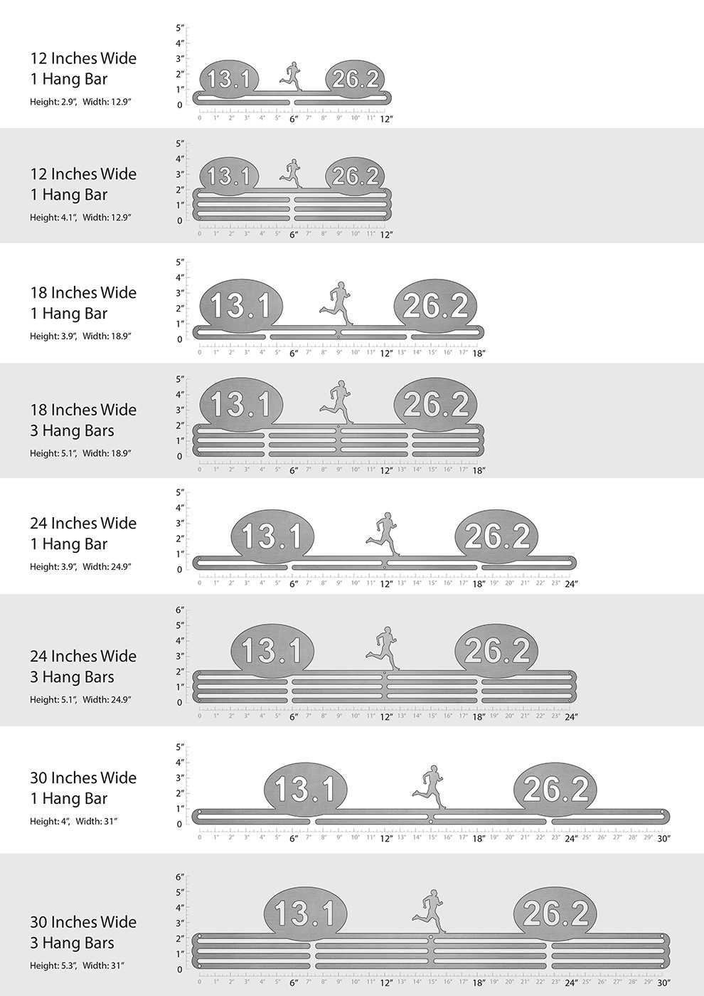 Unsure what size to get? We have created two consistently scaled images to show you what different sized displays look like when filled with medals.