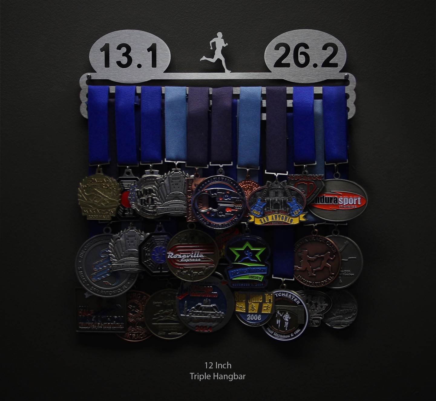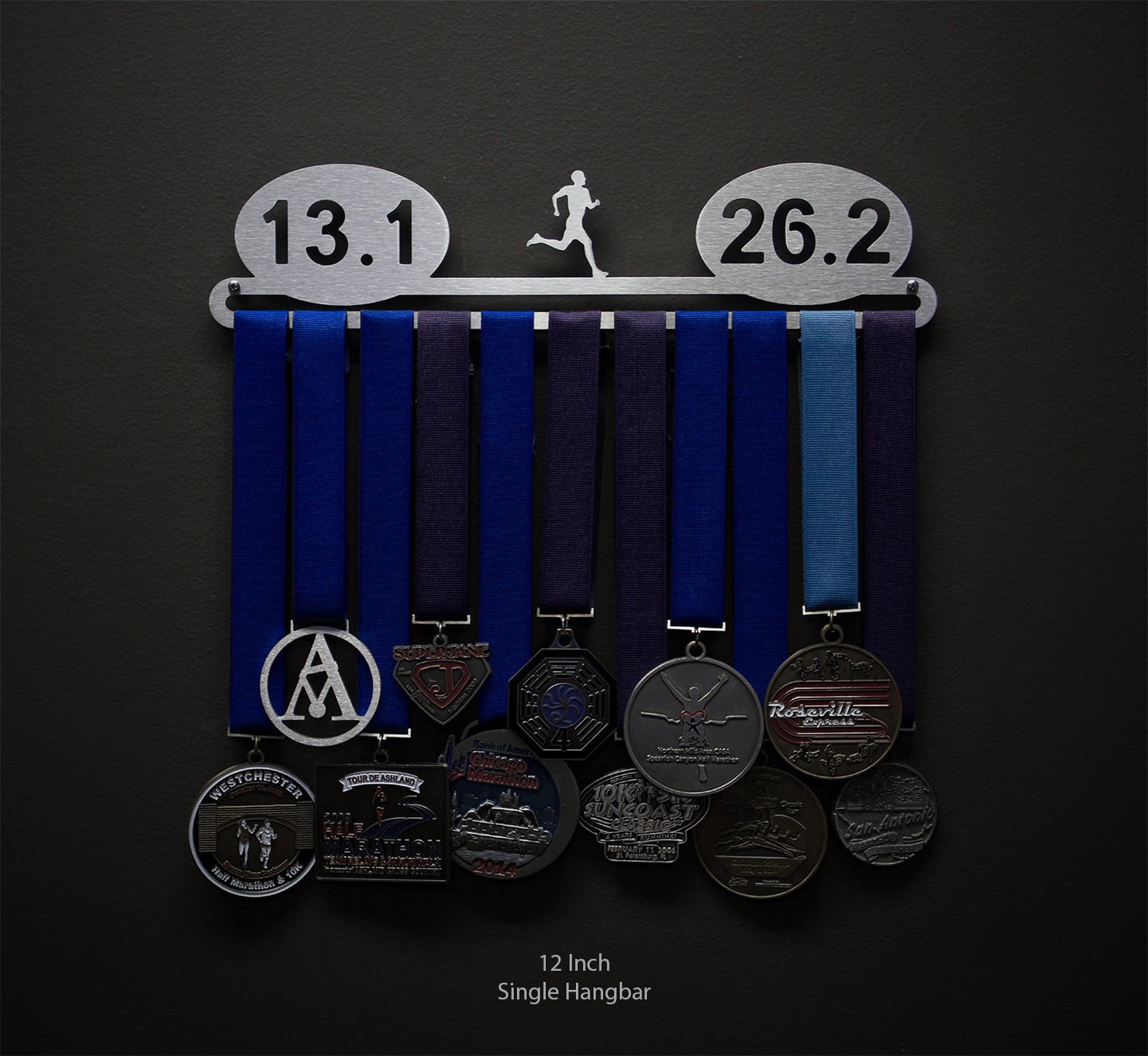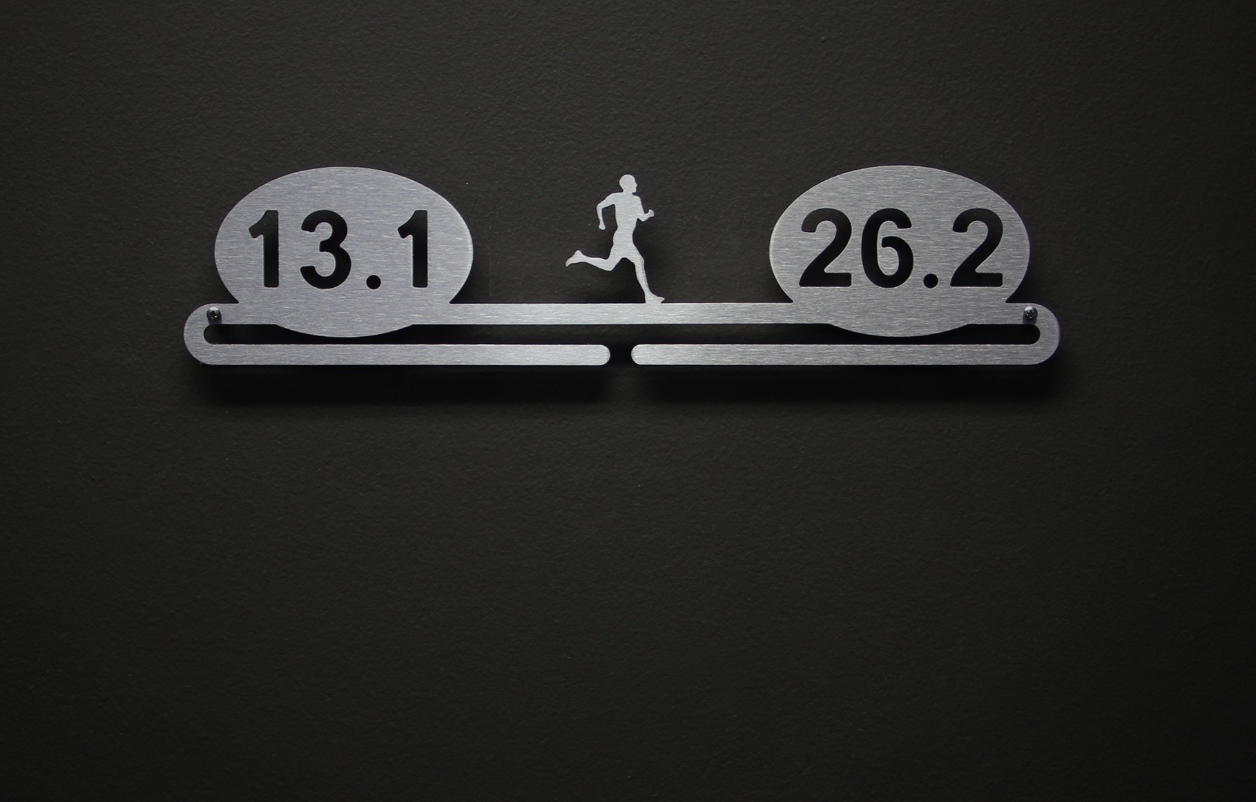 For runners with both half and full marathon finisher medals to display! The medal hanger is laser cut from brushed stainless steel for a look as elegant as you are determined.