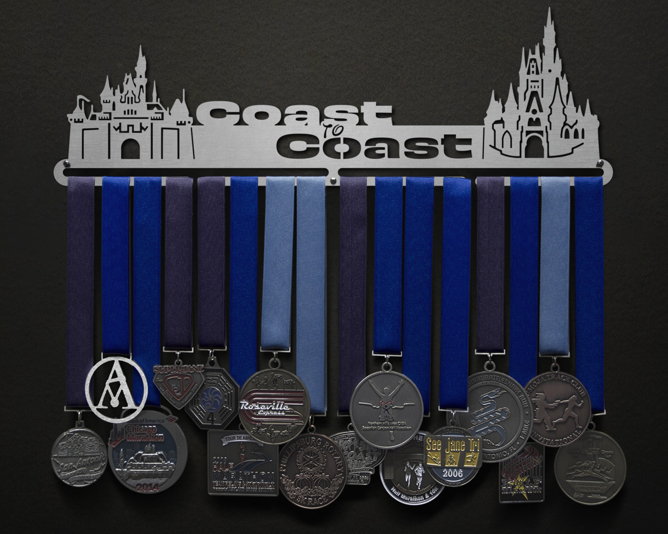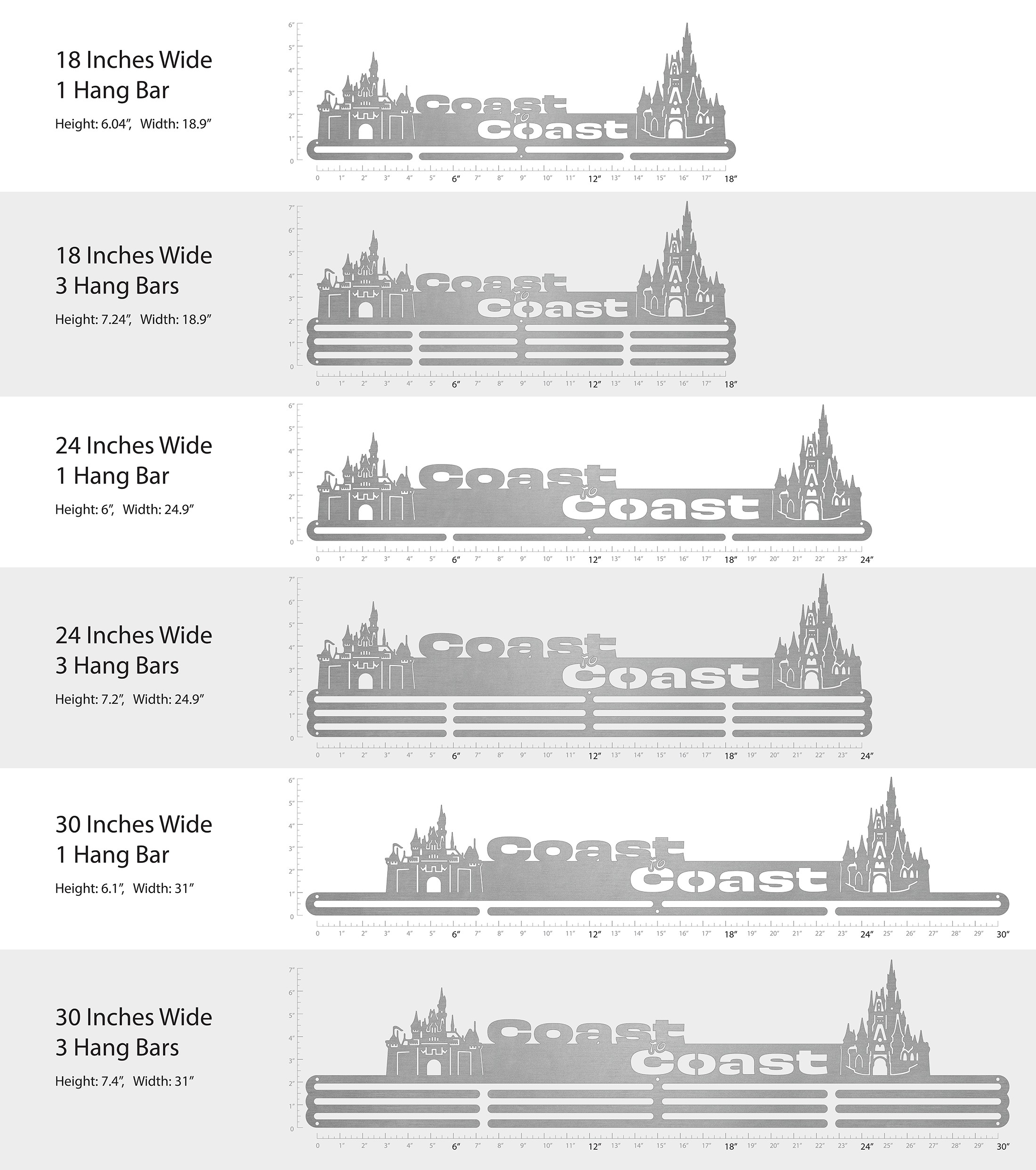 Unsure what size to get? We have created two consistently scaled images to show you what different sized displays look like when filled with medals.