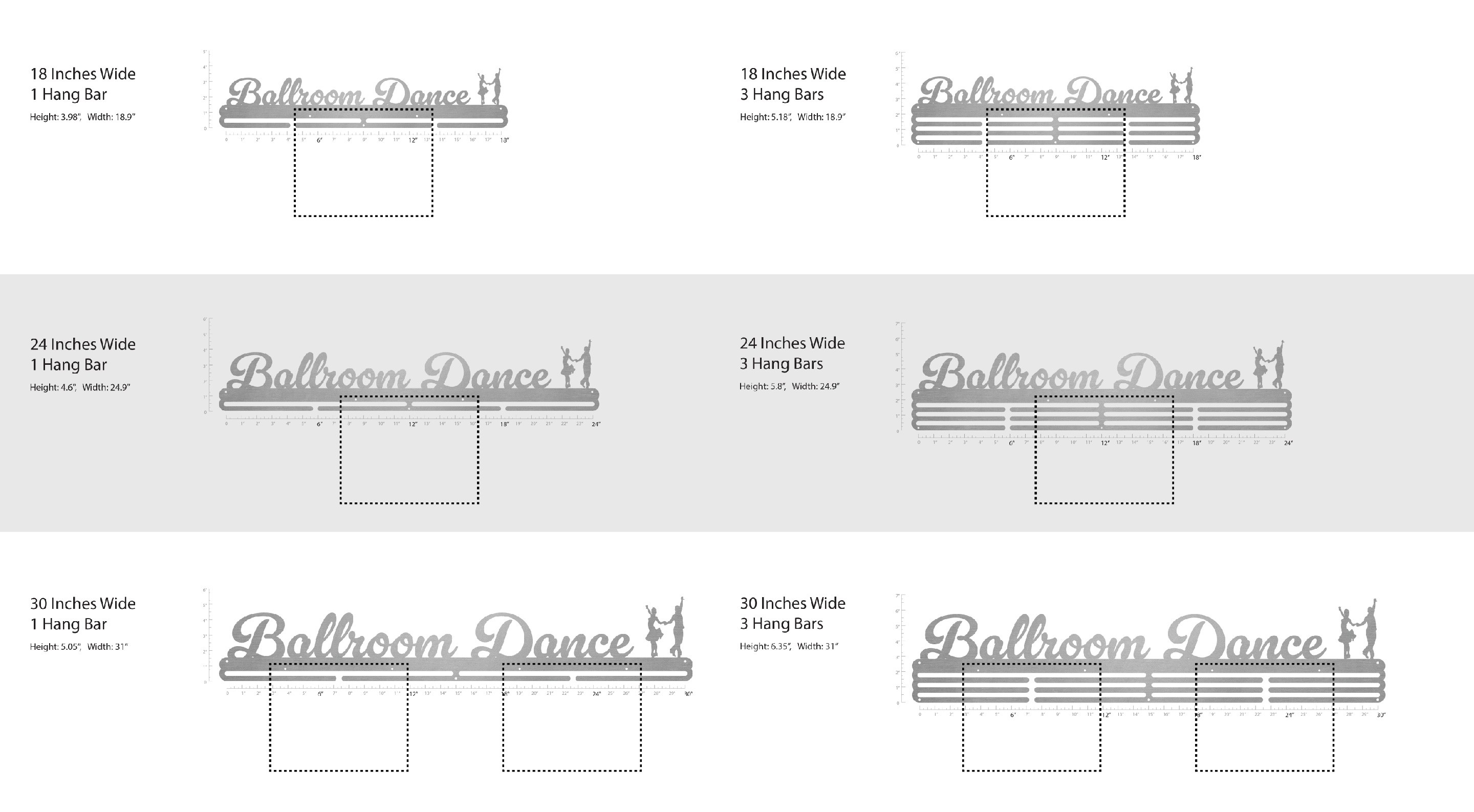 Unsure what size to get? We have created two consistently scaled images to show you what different sized displays look like when filled with medals.