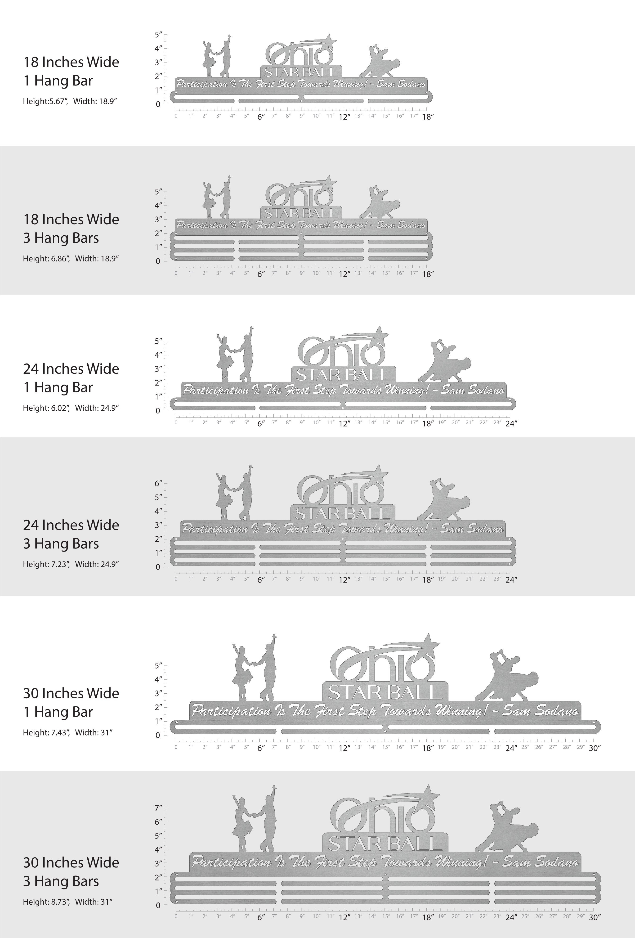Unsure what size to get? We have created two consistently scaled images to show you what different sized displays look like when filled with medals.
