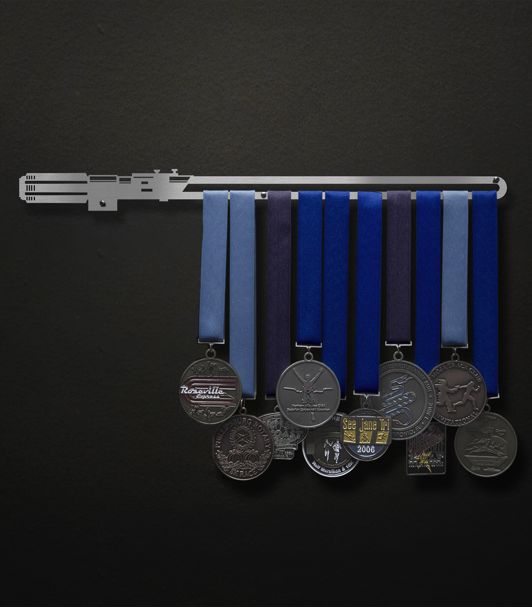NOTE: The handle of the lightsaber design is about 6" wide, so an 18" wide design will hold roughly the same number of medals as a 12" wide design. Conversely, ordering a 24" size will have 18" of useable hang bar space and a 30" wide size will accommodate a similar amount of medals as a 24" wide medal hanger.