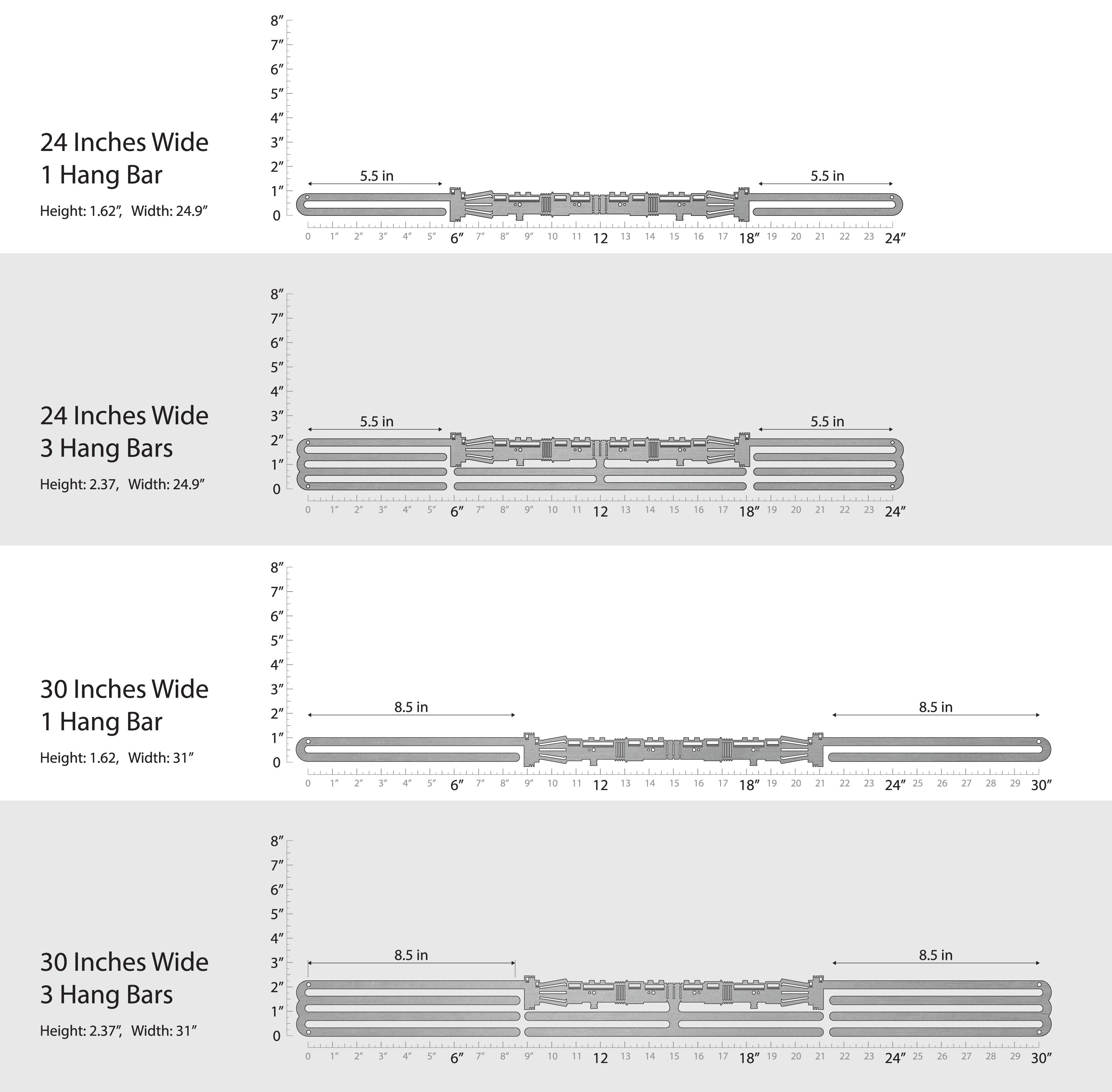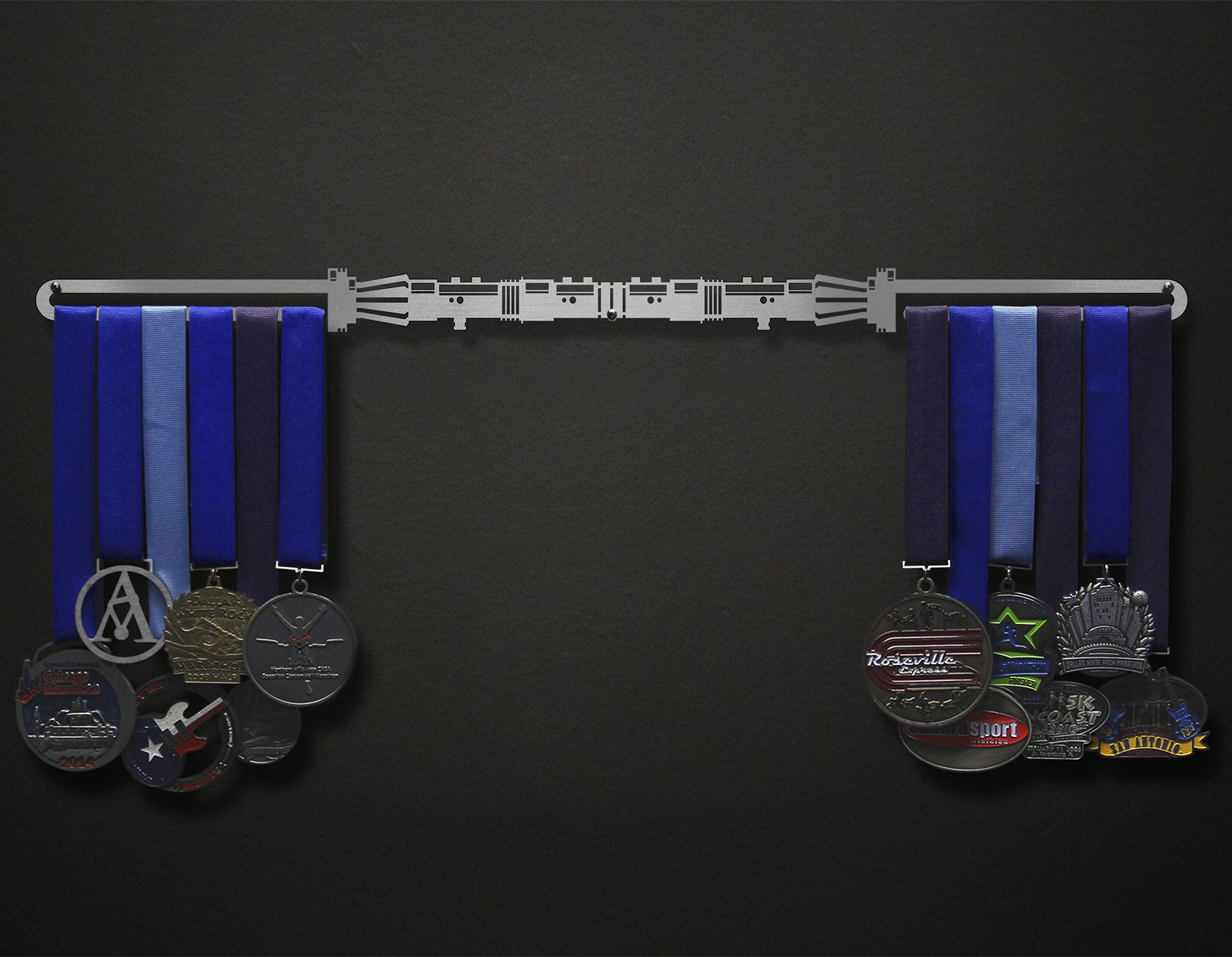 NOTE: The handle of the lightsaber design is about 12" wide, so an 24" wide design will hold roughly the same number of medals as a 12" wide design. Conversely, ordering a 30" size will have 18" of useable hang bar space. Sacrificing a little medal hanger space in lieu of style!
