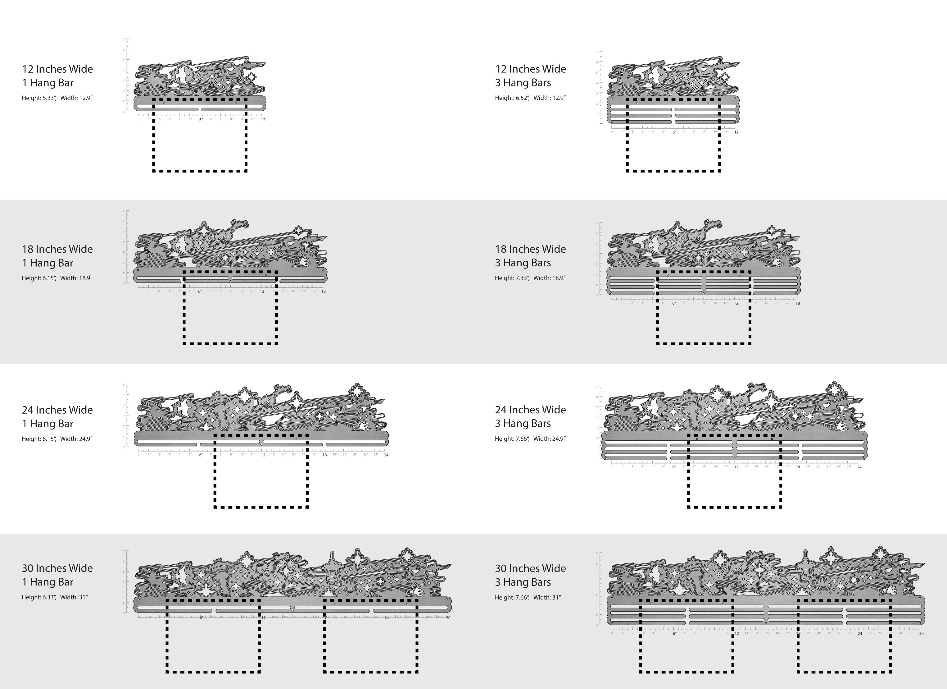 Unsure what size to get? We have created two consistently scaled images to show you what different sized displays look like when filled with medals.
