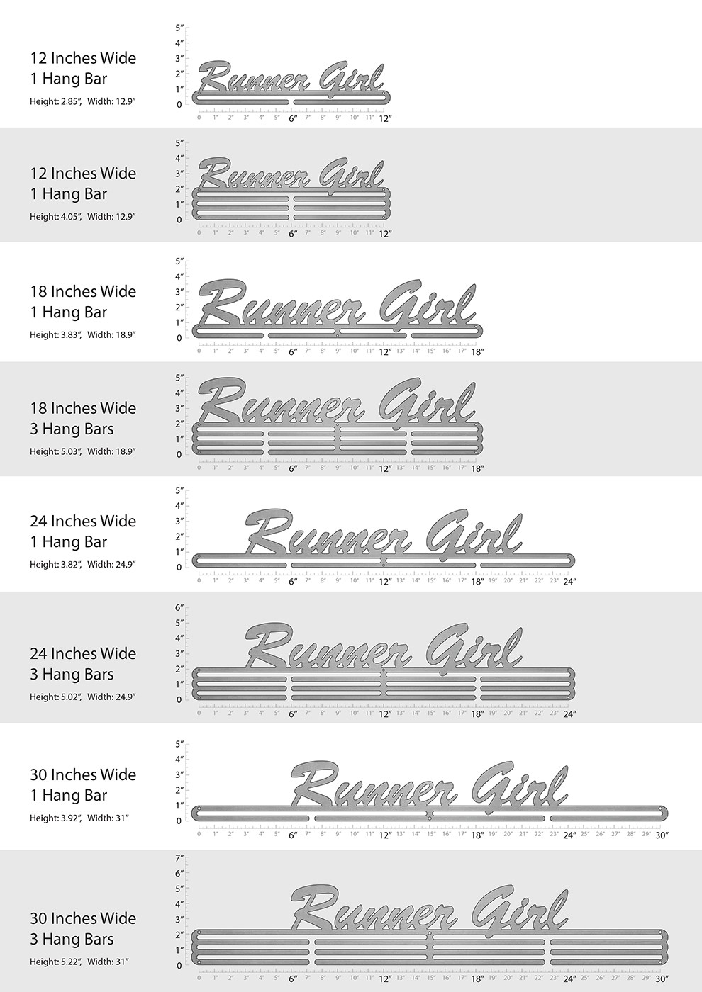 Unsure what size to get? We have created two consistently scaled images to show you what different sized displays look like when filled with medals.