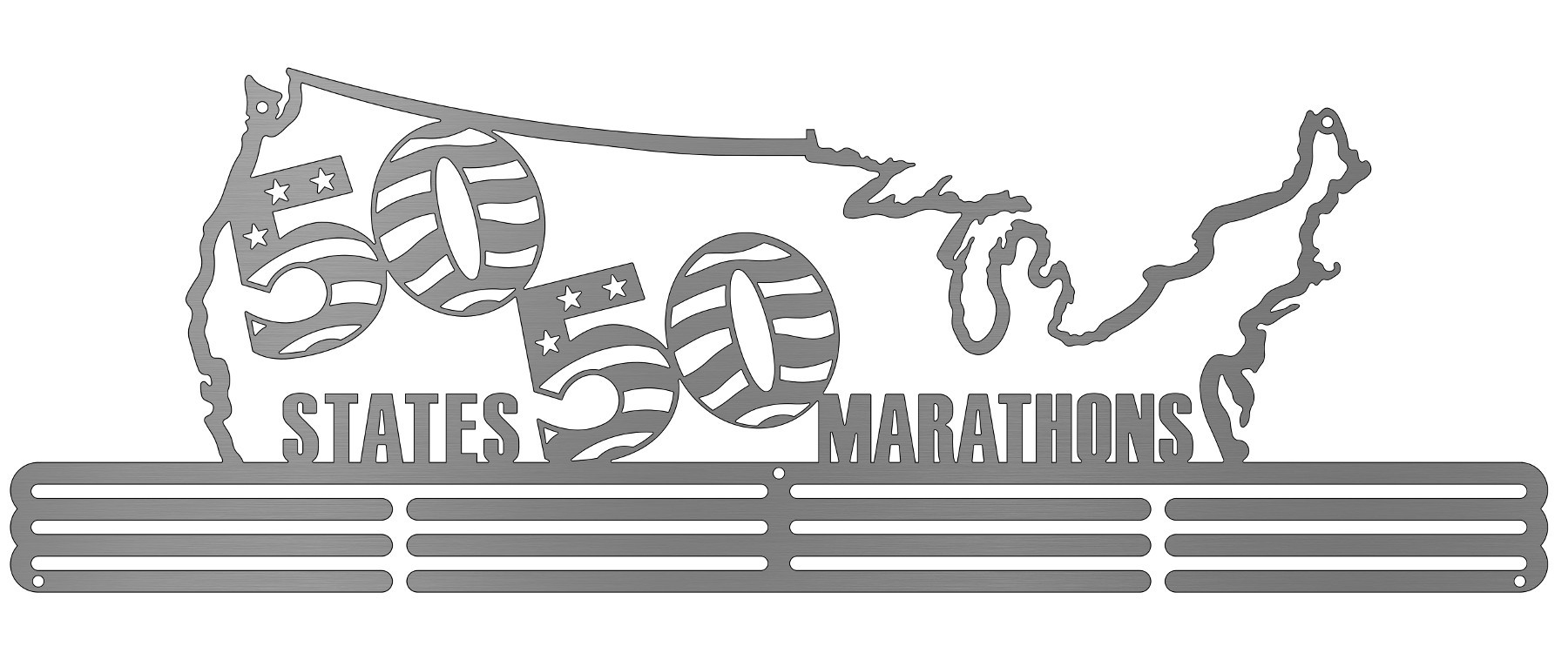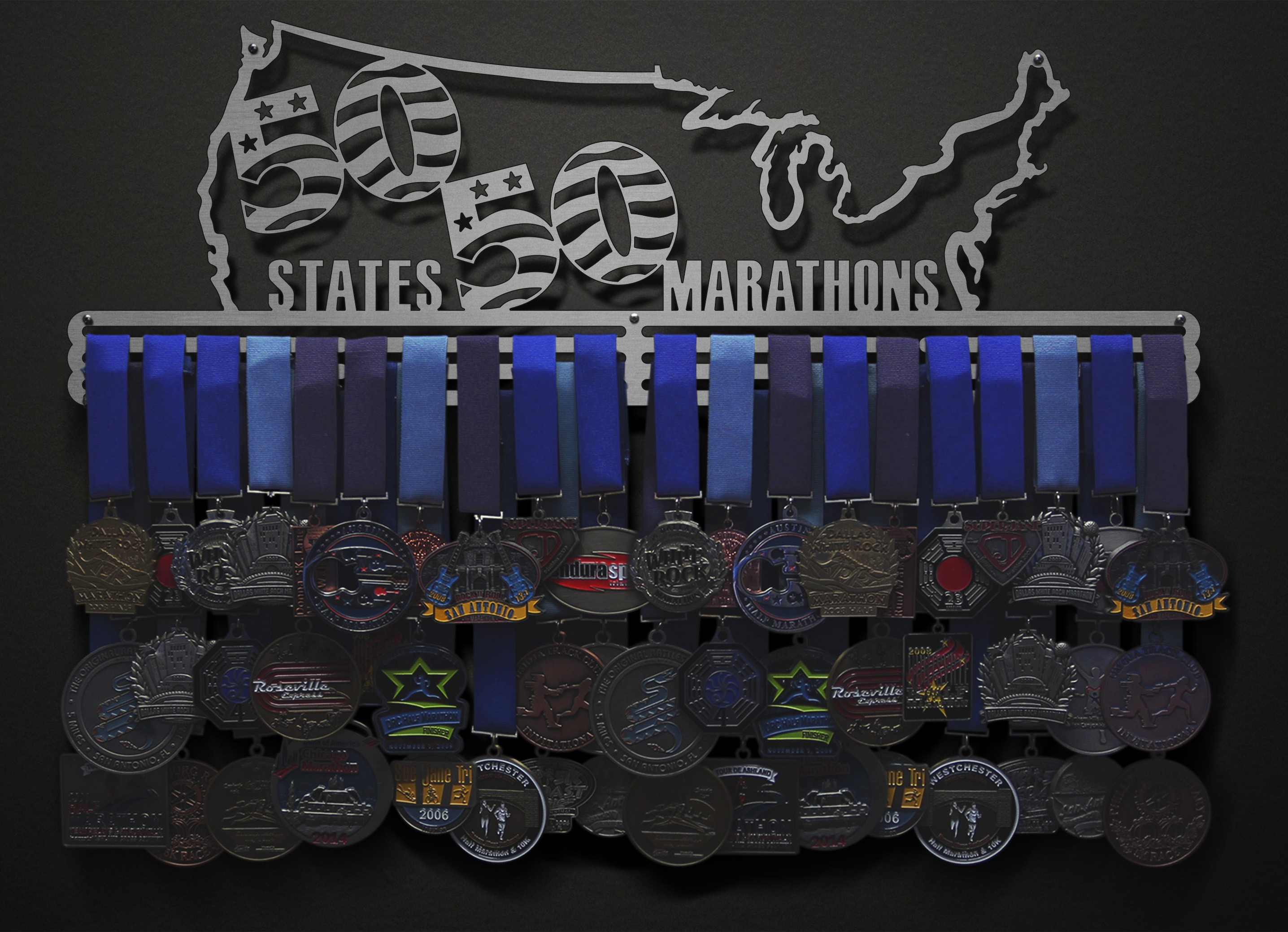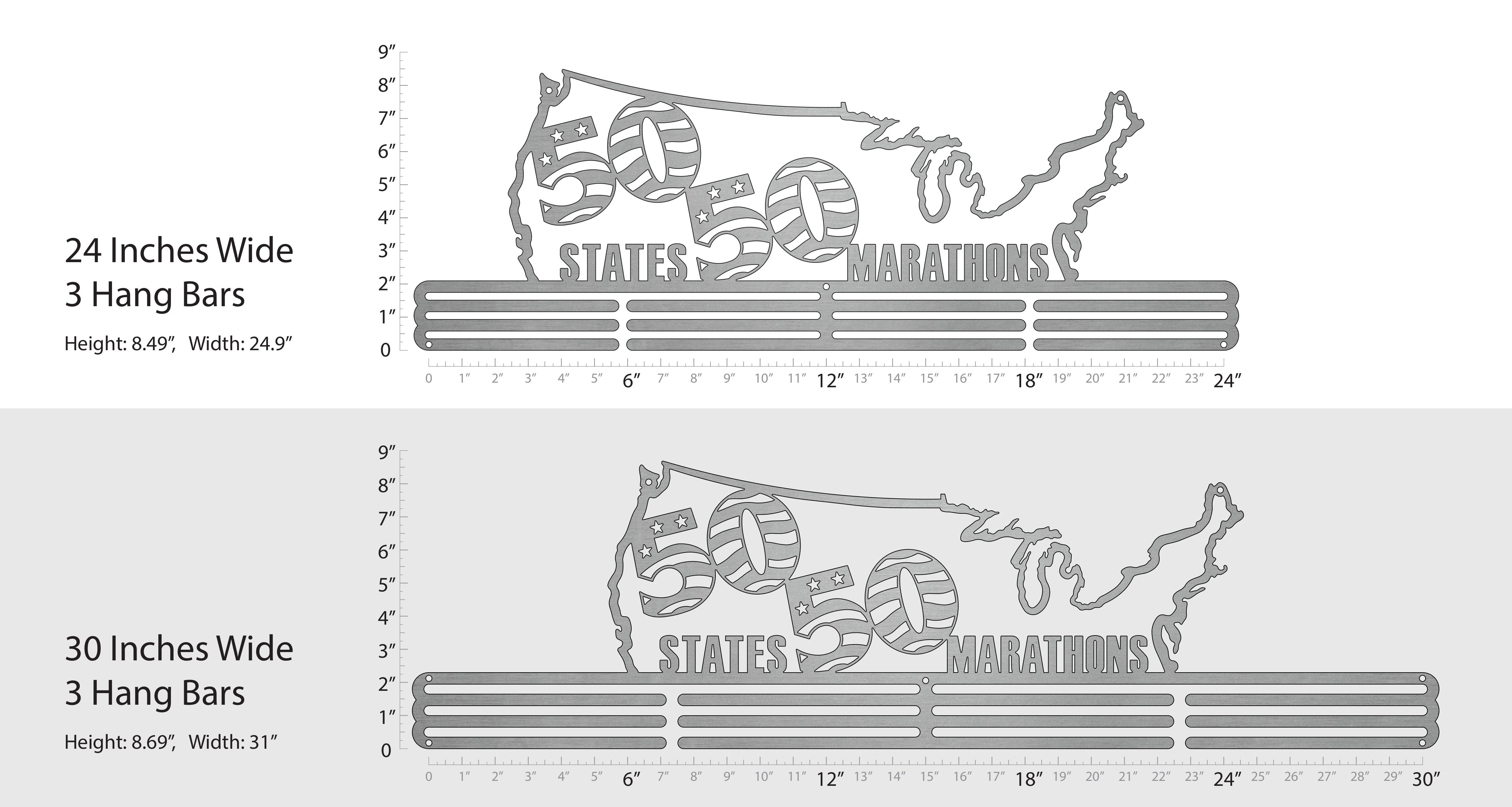 Finally, a hanger for 50 Marathons in 50 States! At 24" wide with three bars, this display is meant to hold all 50 medals and comes with ribbon clips to shorten or stagger the lengths of the ribbons so all can be seen! We also offer a 30" wide version, in case you want a little extra space for your medals.