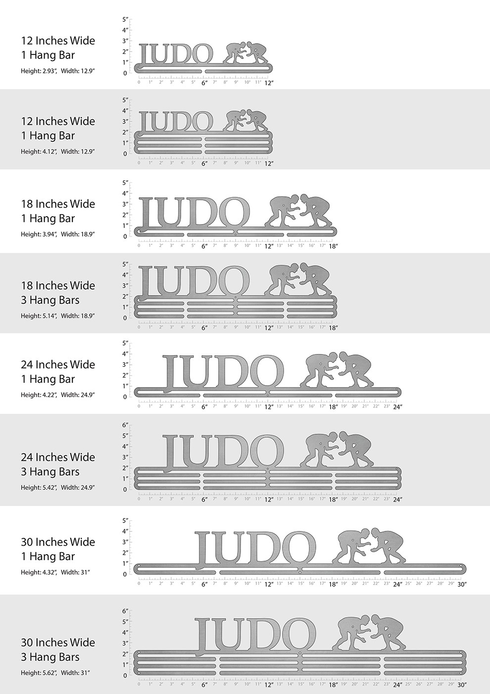Unsure what size to get? We have created two consistently scaled images to show you what different sized displays look like when filled with medals.