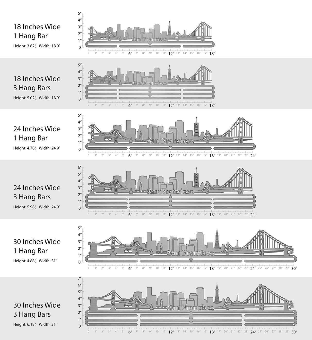 Unsure what size to get? We have created two consistently scaled images to show you what different sized displays look like when filled with medals.