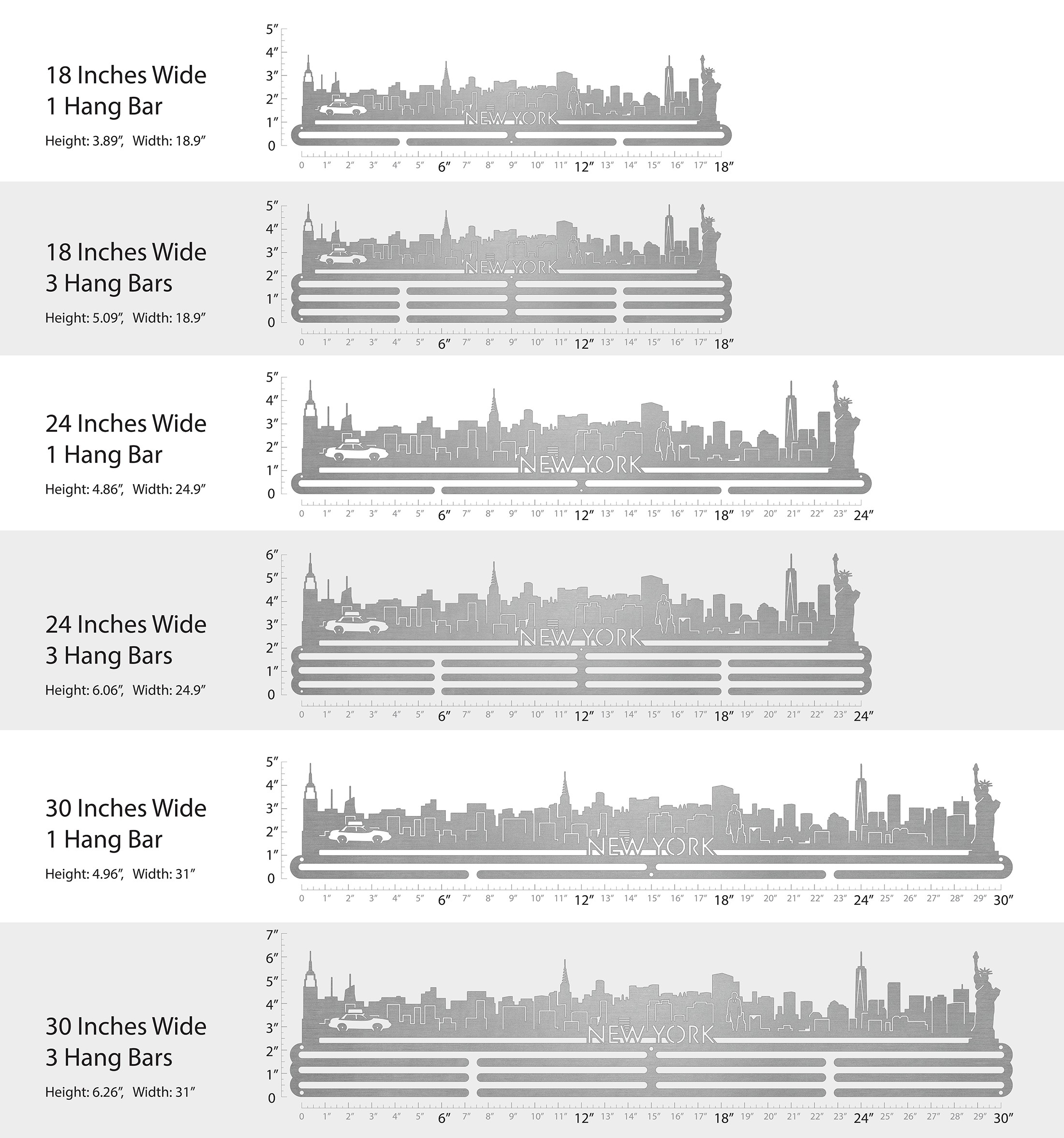 Unsure what size to get? We have created two consistently scaled images to show you what different sized displays look like when filled with medals.