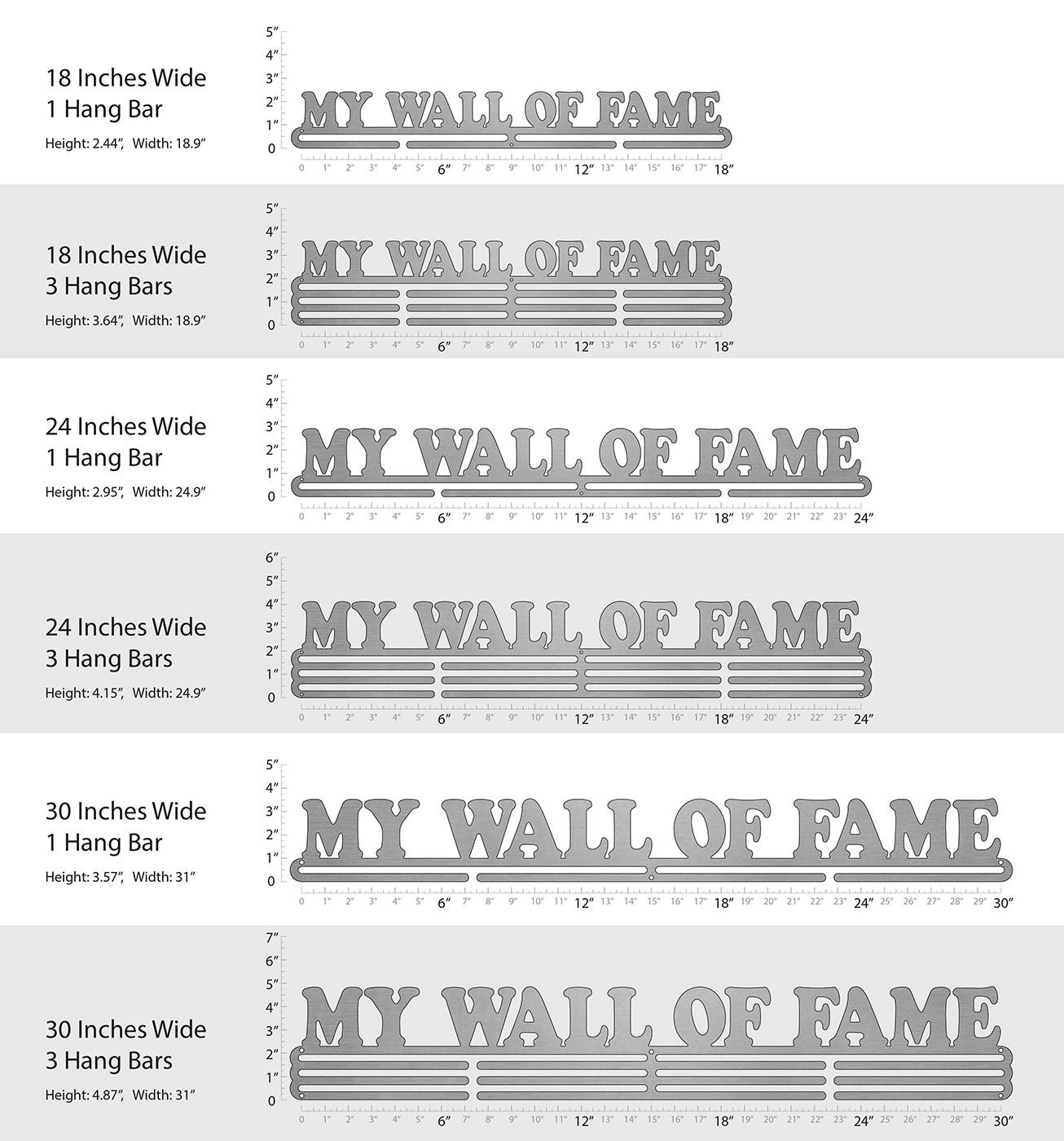 Unsure what size to get? We have created two consistently scaled images to show you what different sized displays look like when filled with medals.