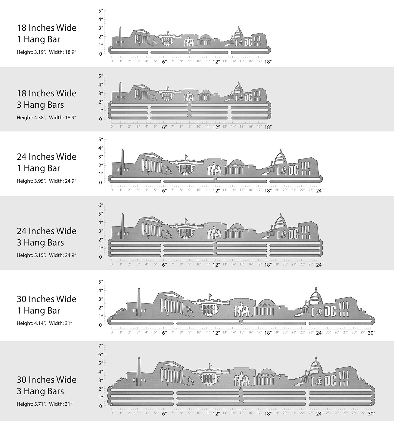 Unsure what size to get? We have created two consistently scaled images to show you what different sized displays look like when filled with medals.