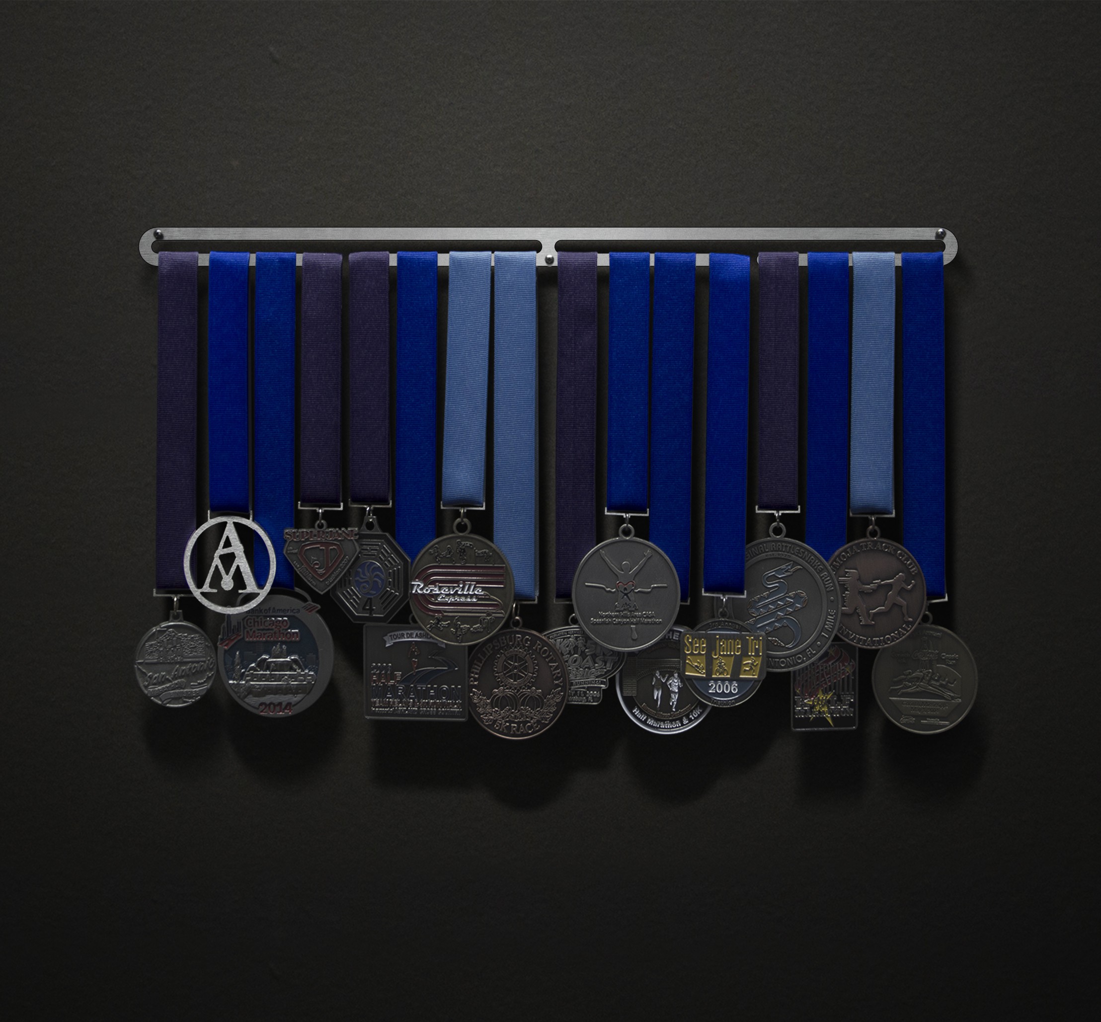 A hang bar ONLY with no text or images on it at all. This is perfect for those who already have a display filled with medals and would simply like more room to hang them from, rather than buying a whole new display. We've made lots of different sized displays in the past - most all sizes are available here.