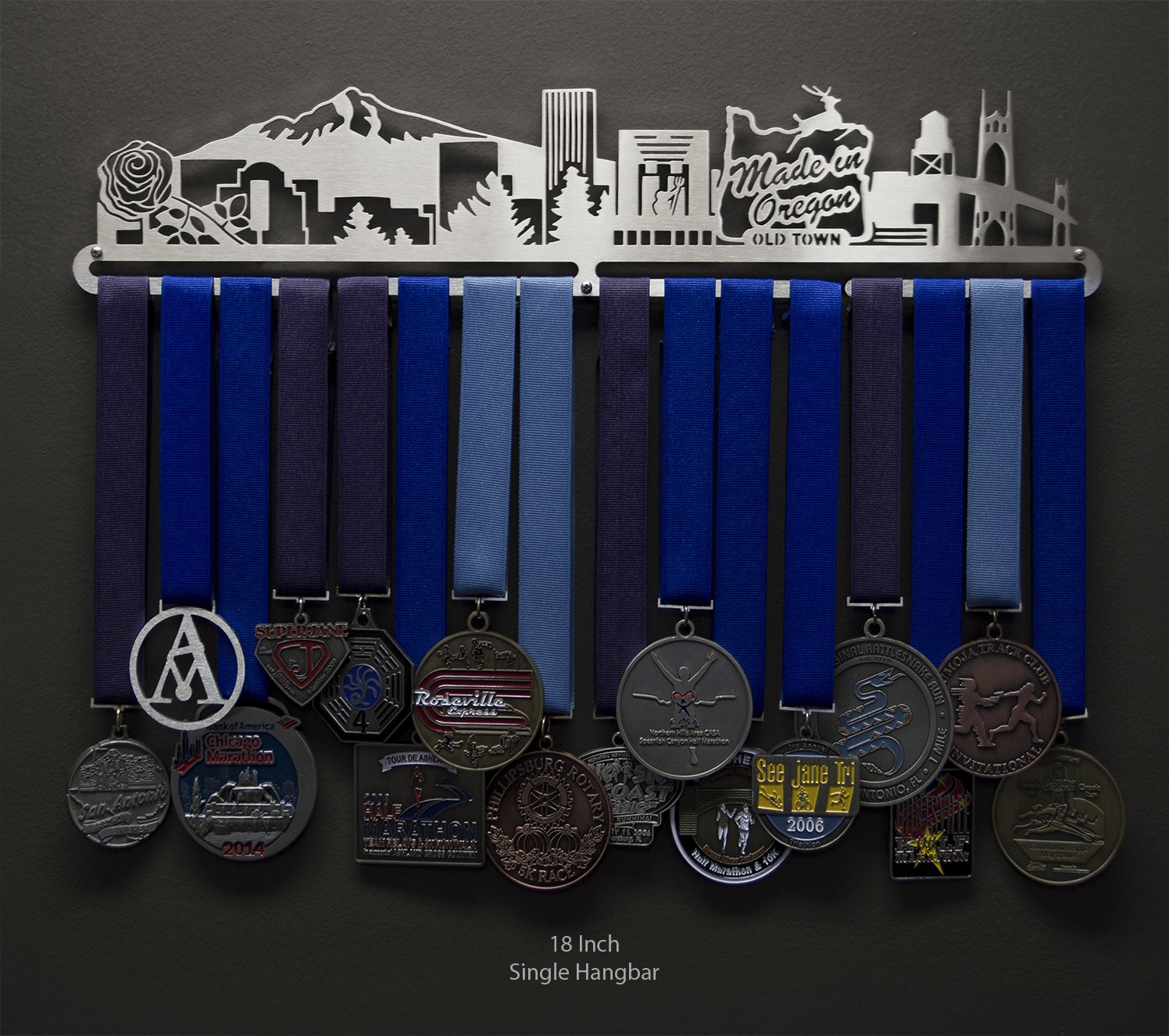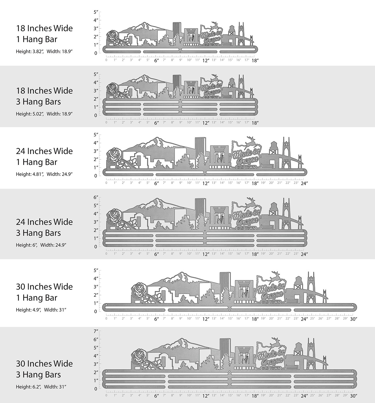 Unsure what size to get? We have created two consistently scaled images to show you what different sized displays look like when filled with medals.