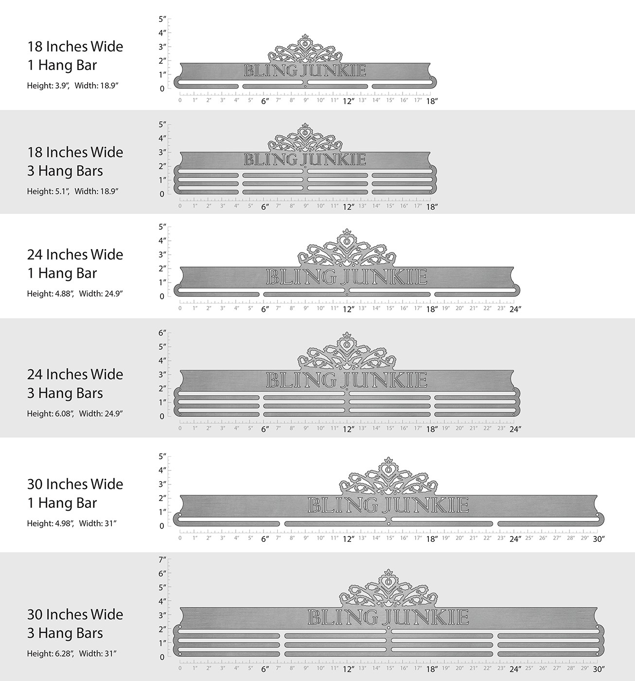 Unsure what size to get? We have created two consistently scaled images to show you what different sized displays look like when filled with medals.