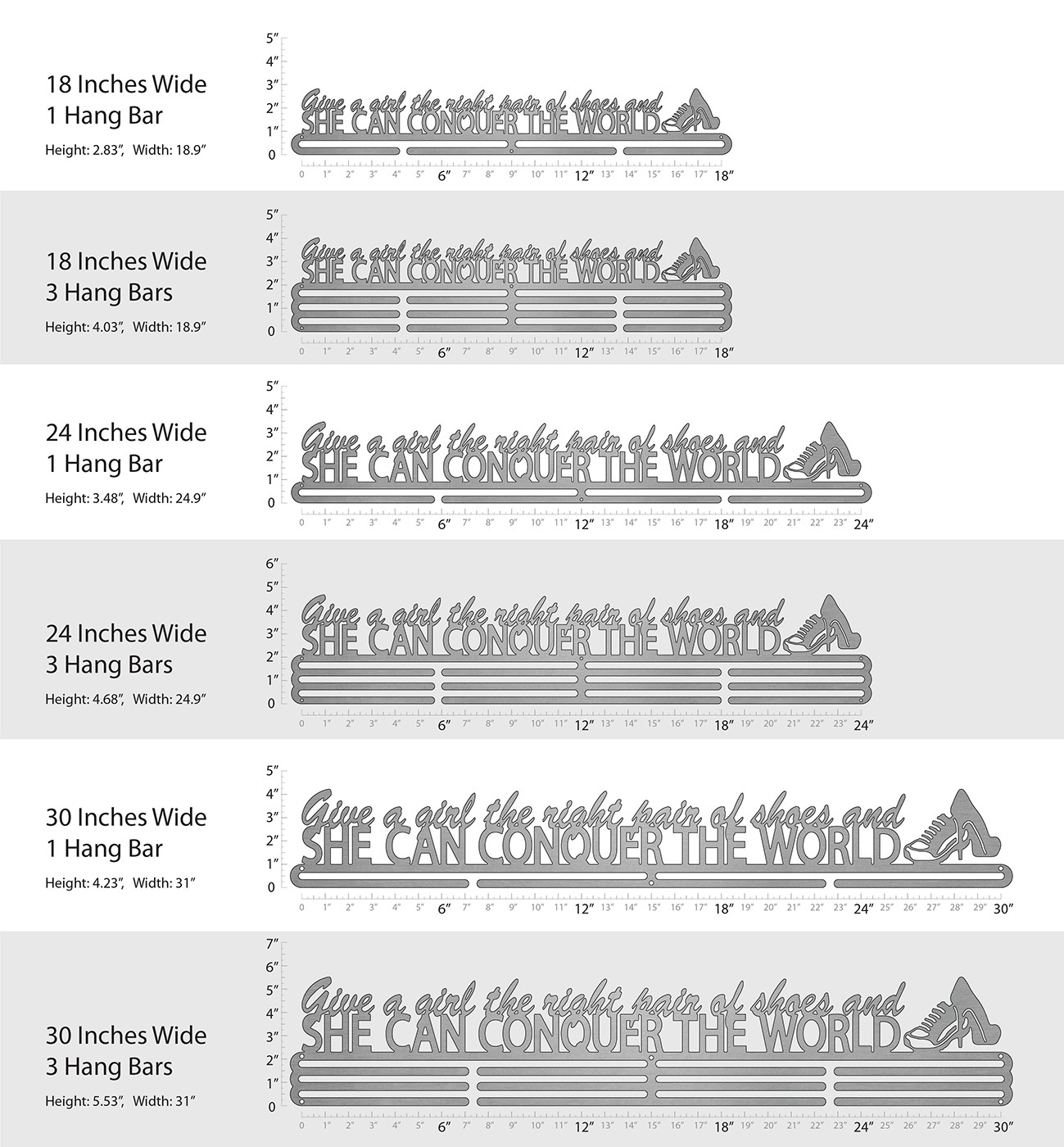 Unsure what size to get? We have created two consistently scaled images to show you what different sized displays look like when filled with medals.