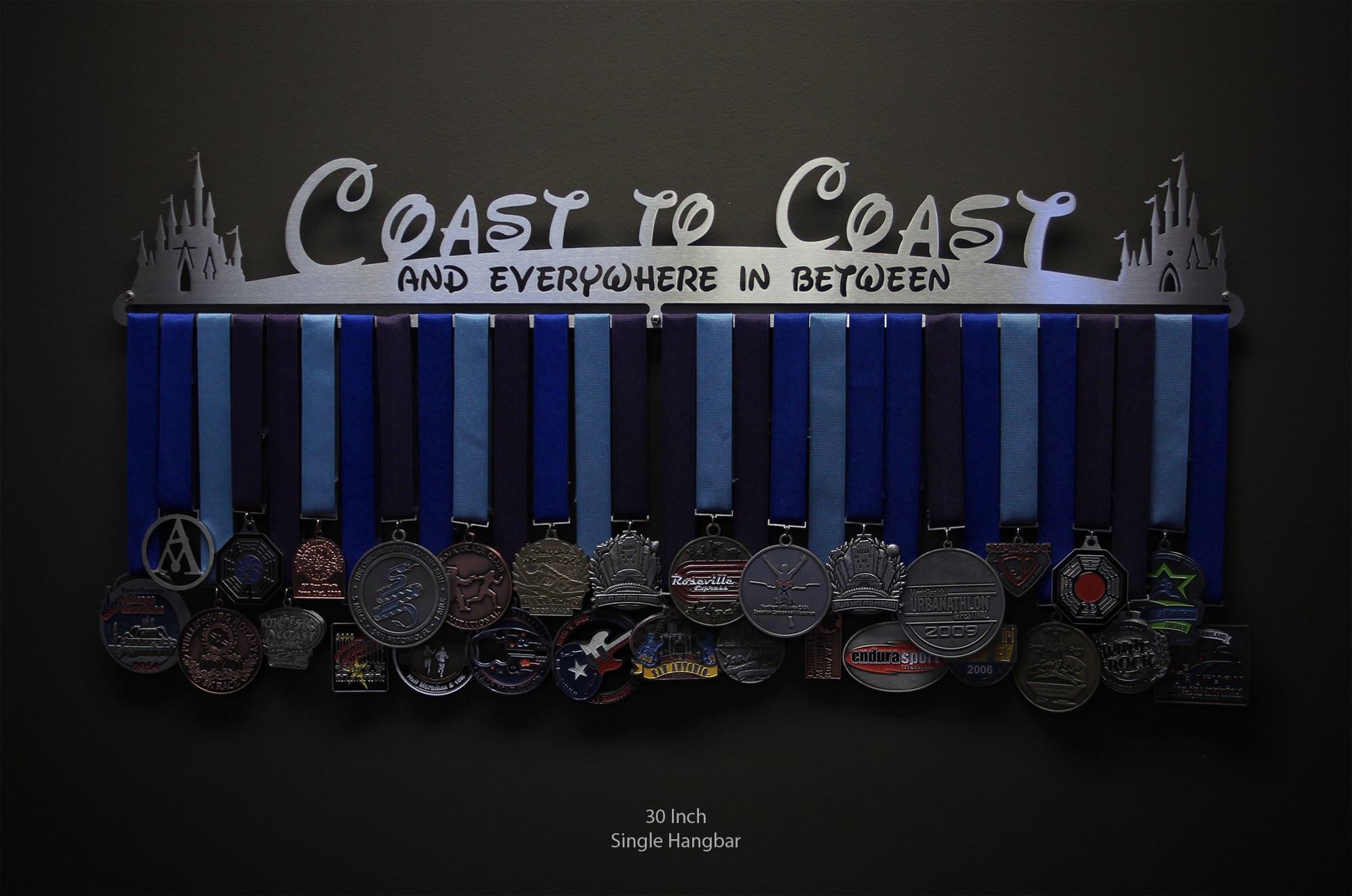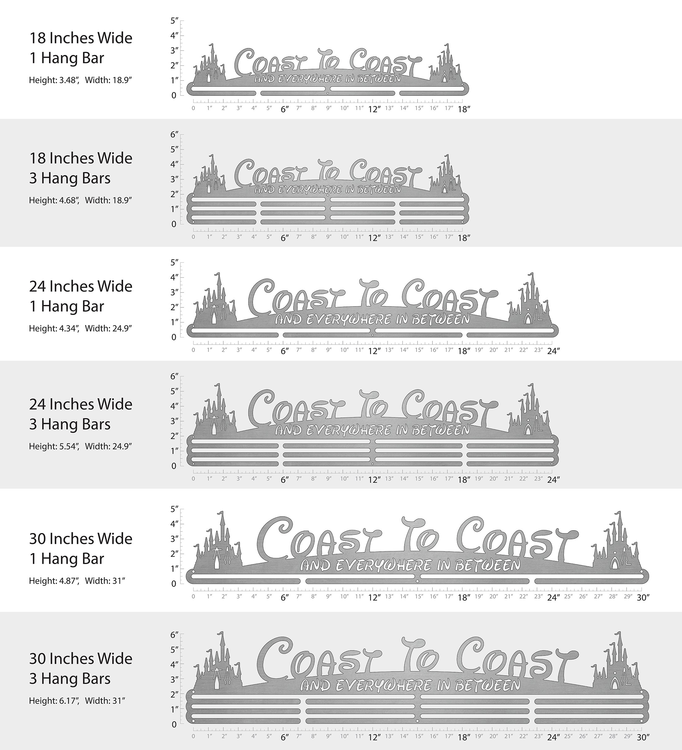 Unsure what size to get? We have created two consistently scaled images to show you what different sized displays look like when filled with medals.