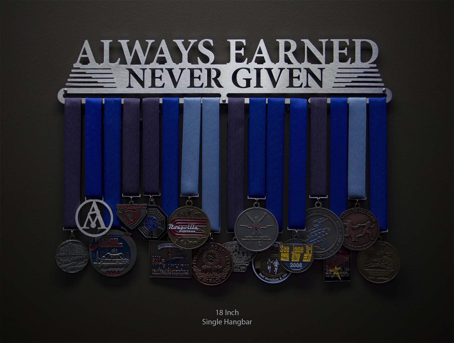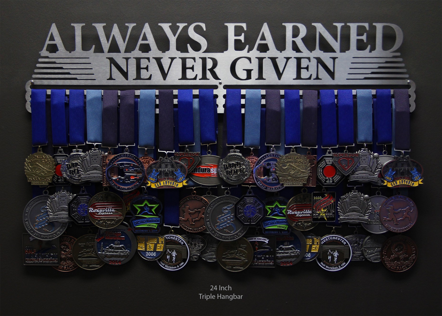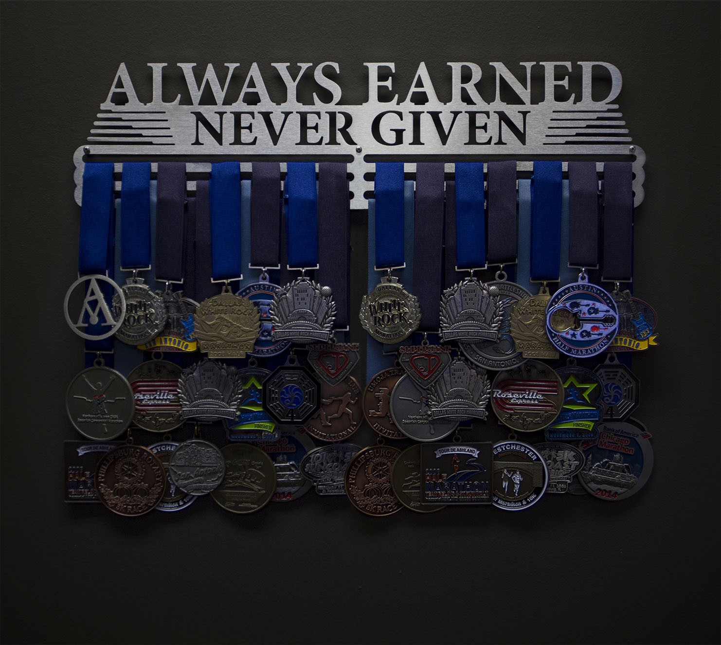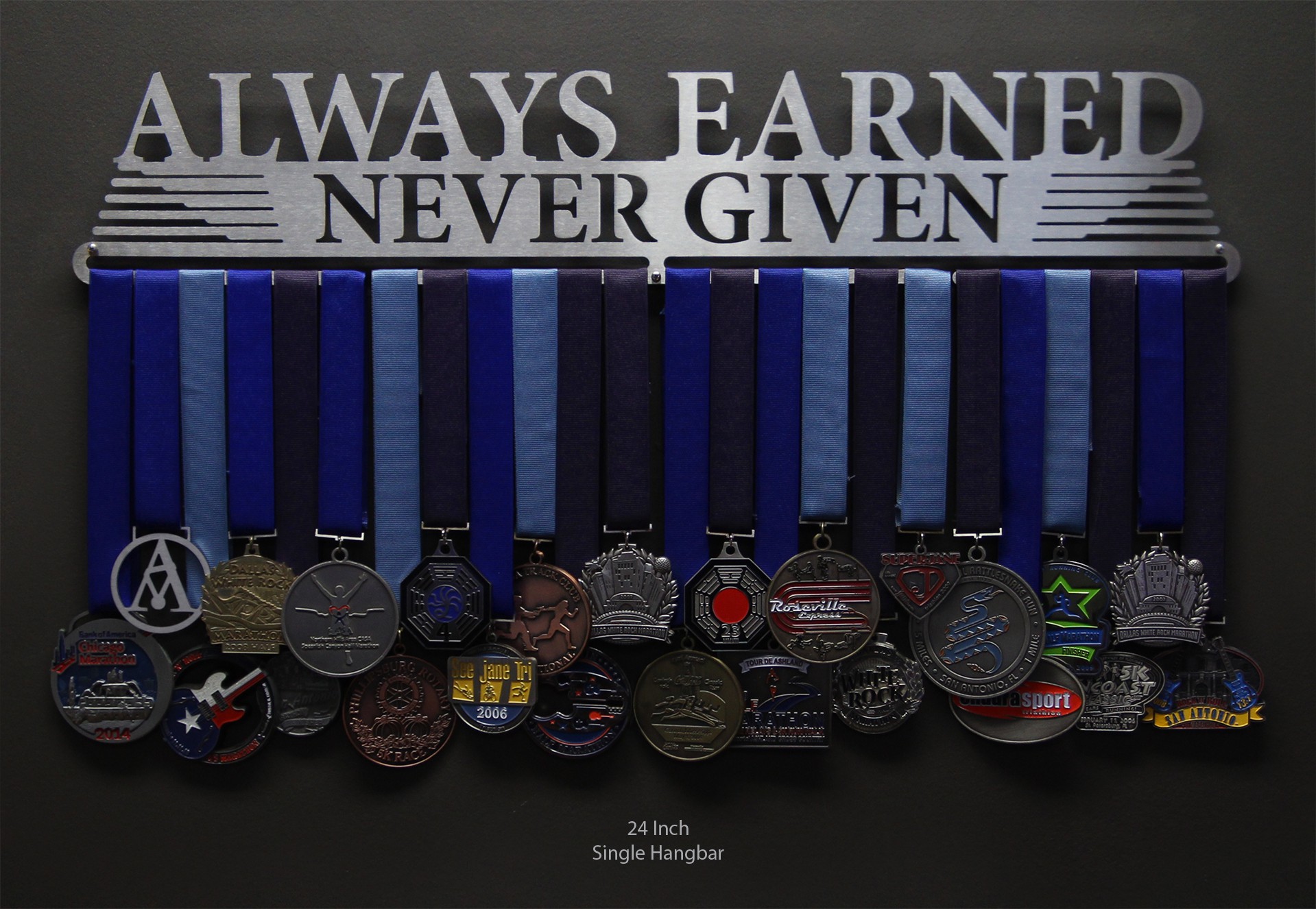 Anything you accomplish is accomplished by YOU. No one else can do it for you. Whether you're faced with a tough game, grueling race, or long distance marathon, you can never expect to be given anything. Think of your medals as badges of courage, strength and determination. Then display them loud and proud with this laser cut stainless steel medal display. This hanger is only for earned medals, never given ones.