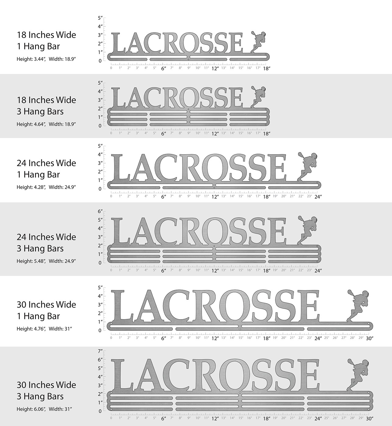 Unsure what size to get? We have created two consistently scaled images to show you what different sized displays look like when filled with medals.