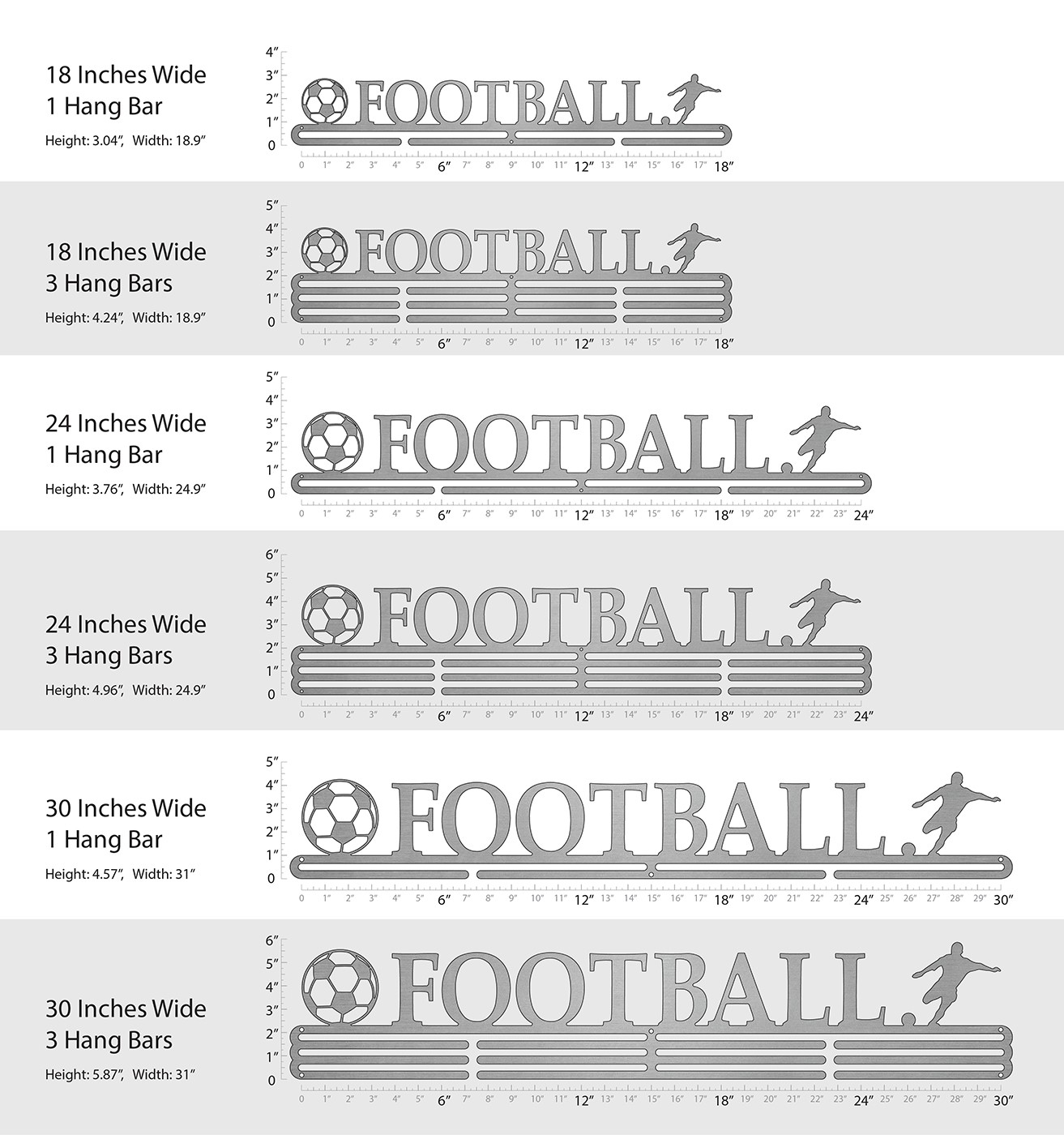 Unsure what size to get? We have created two consistently scaled images to show you what different sized displays look like when filled with medals.