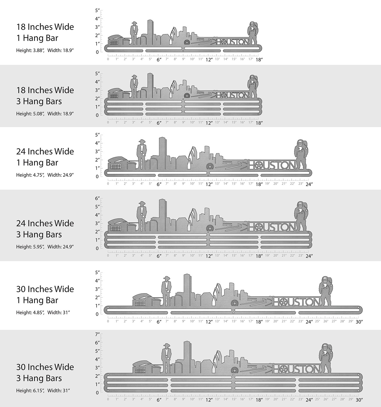 Unsure what size to get? We have created two consistently scaled images to show you what different sized displays look like when filled with medals.