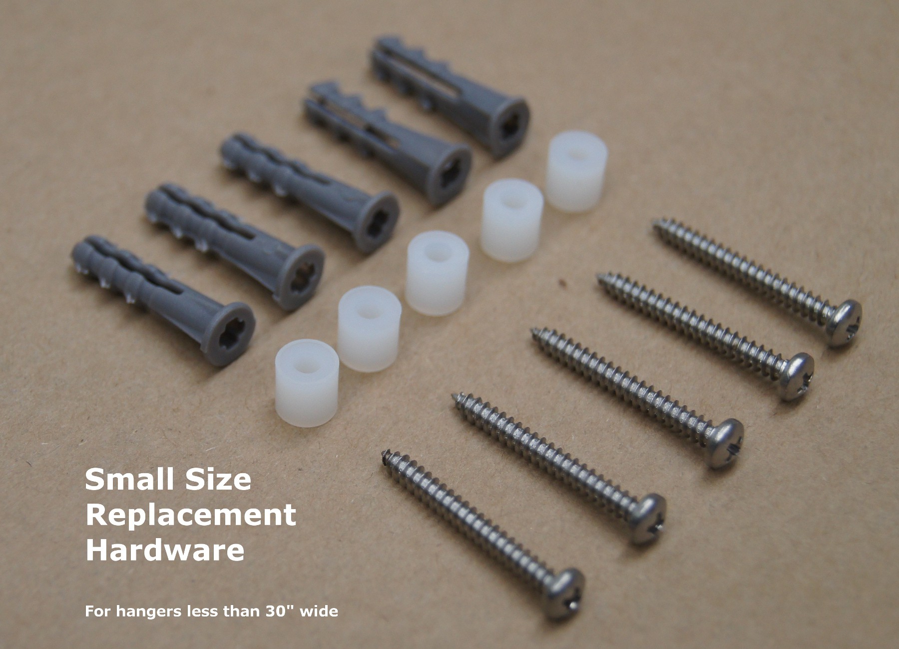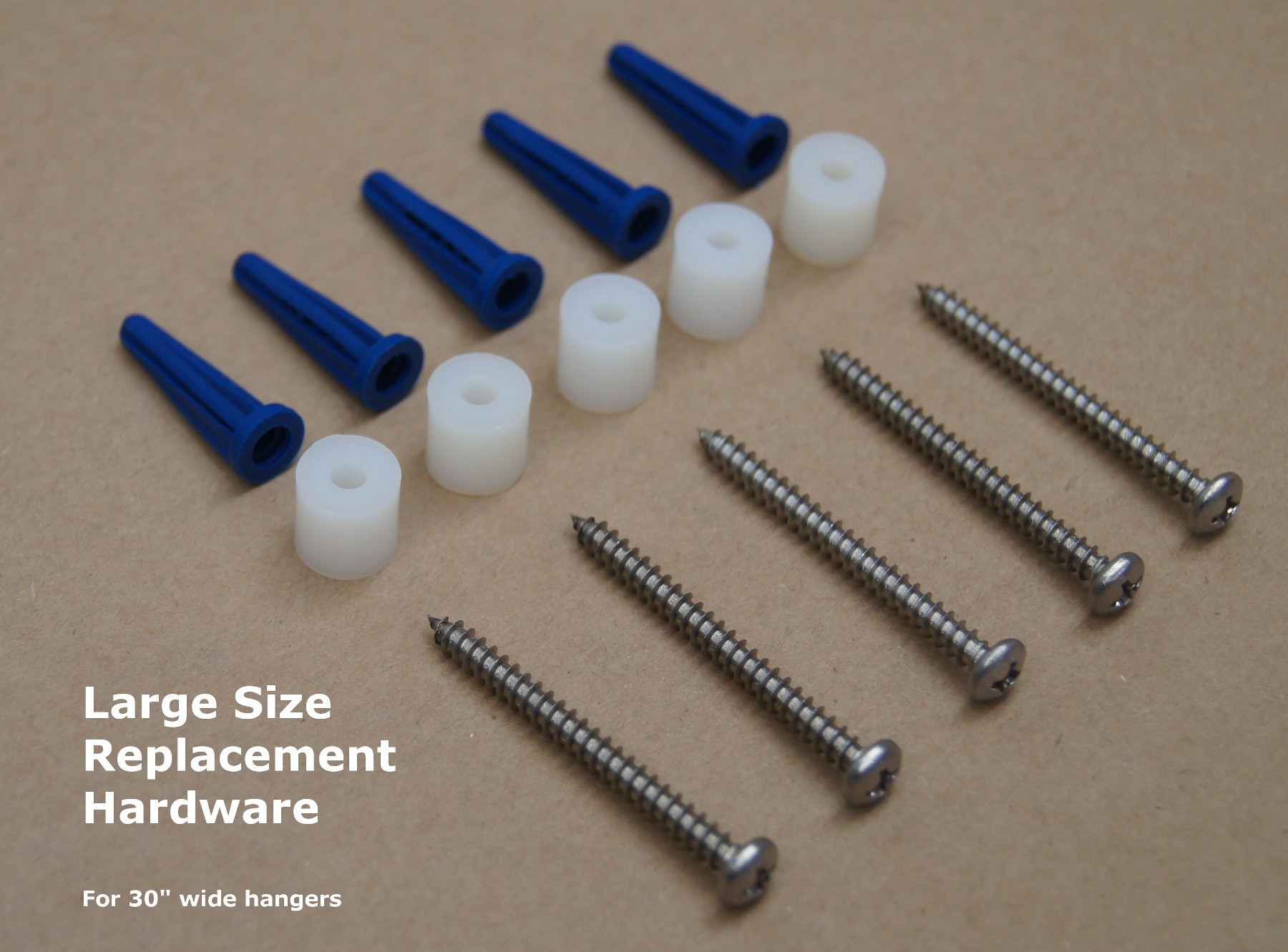 5-LG: For 30" wide medal hangers. Includes a set of FIVE screws (1-1/2" long #6), spacers (3/8"), and drywall anchors