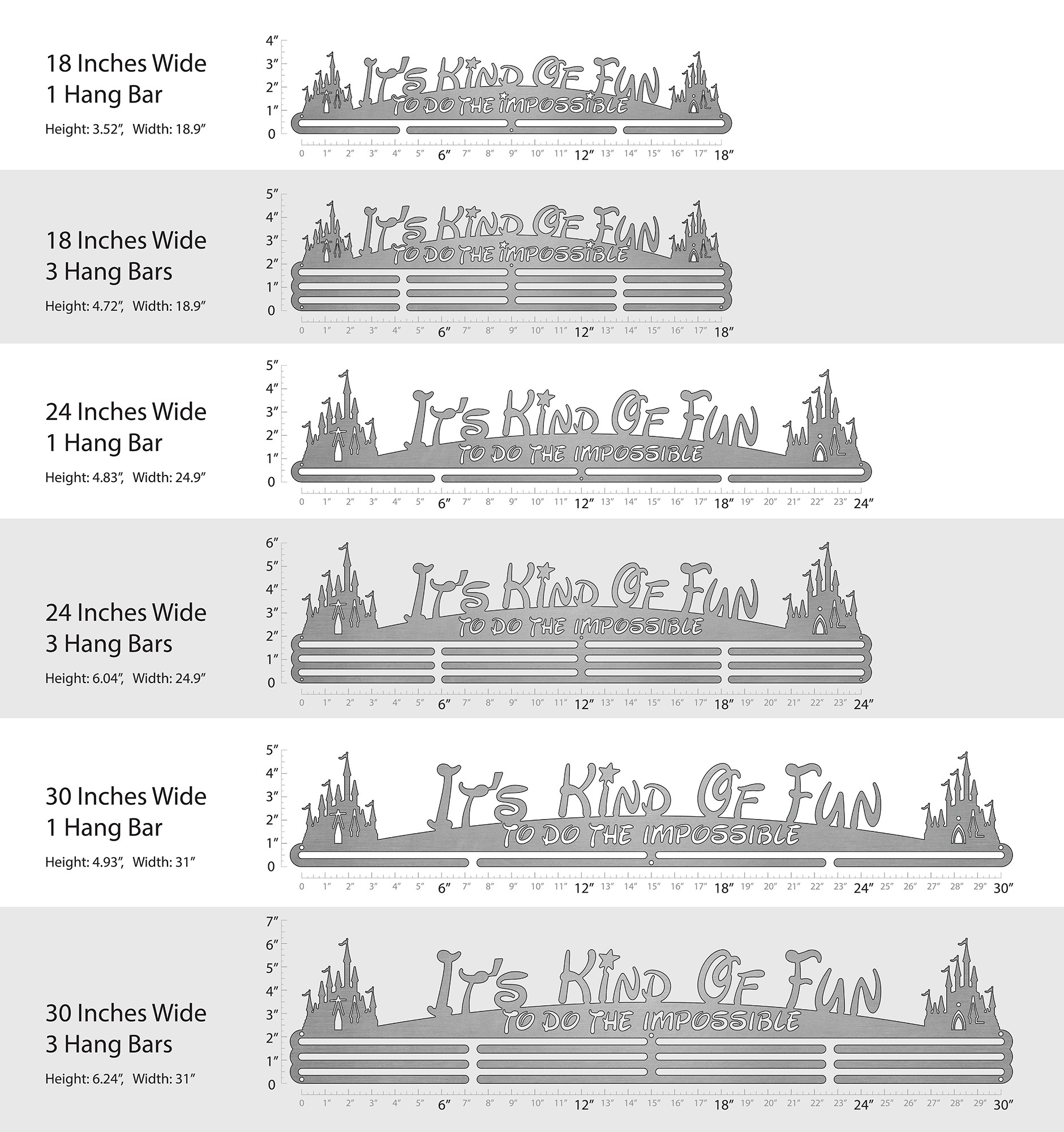 Unsure what size to get? We have created two consistently scaled images to show you what different sized displays look like when filled with medals.