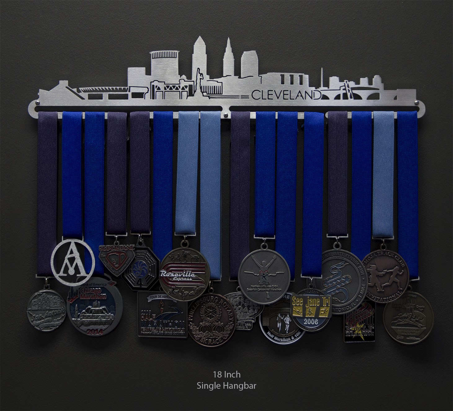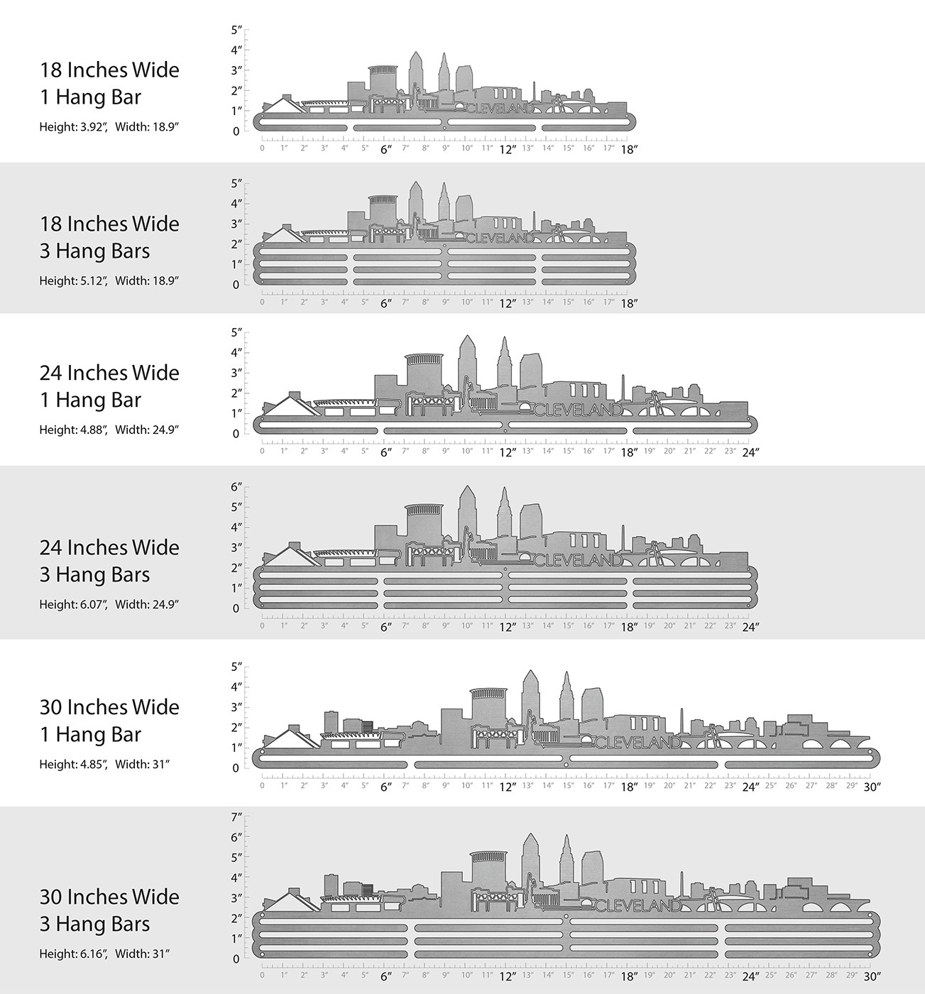Unsure what size to get? We have created two consistently scaled images to show you what different sized displays look like when filled with medals.