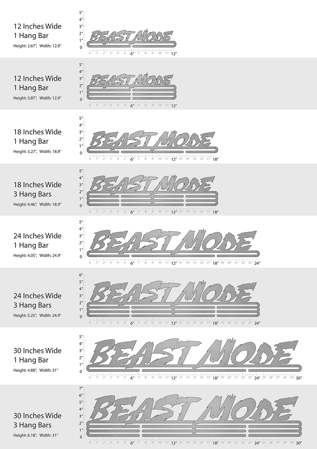 Unsure what size to get? We have created two consistently scaled images to show you what different sized displays look like when filled with medals.