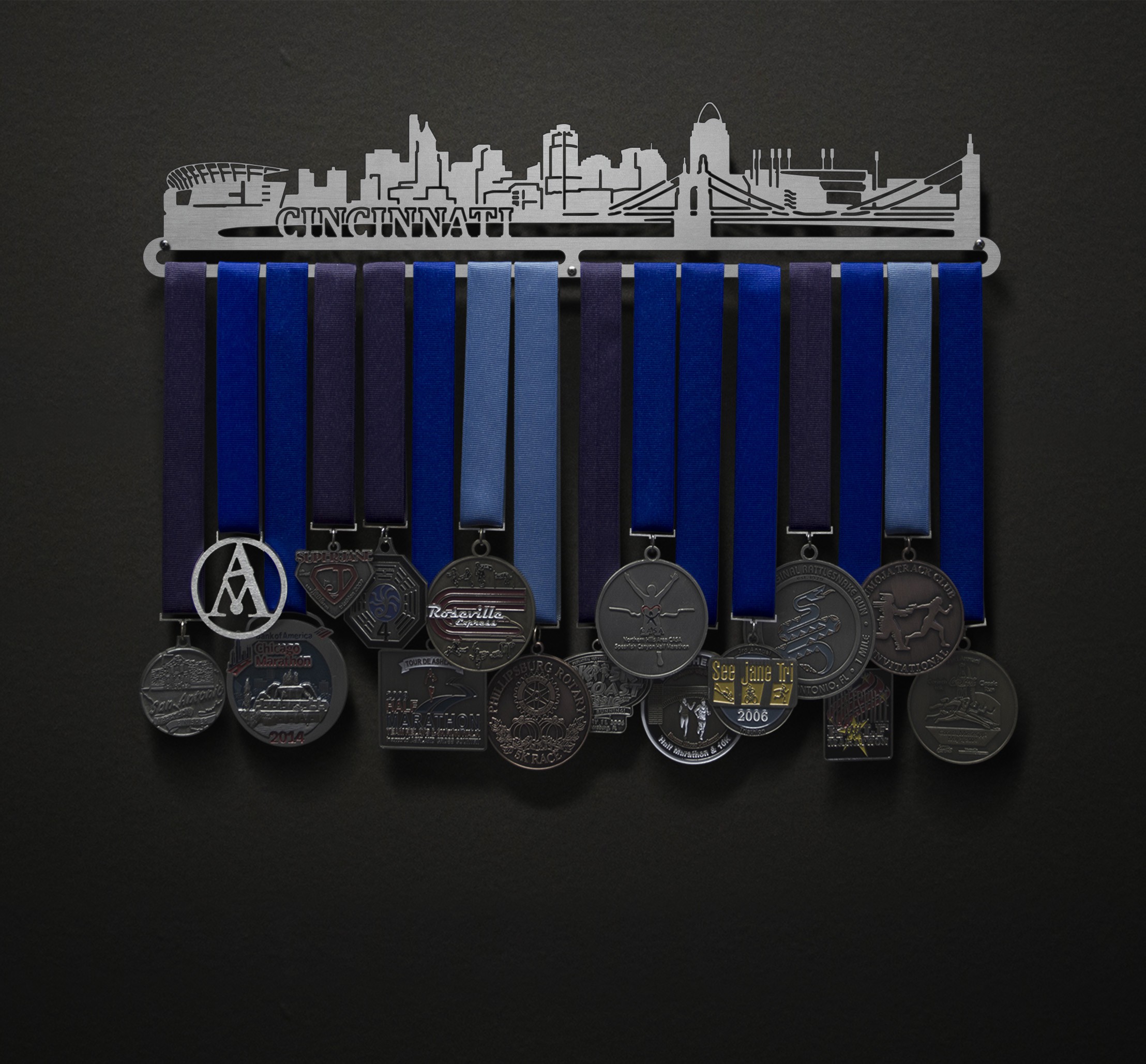 Unsure what size to get? We have created two consistently scaled images to show you what different sized displays look like when filled with medals.
