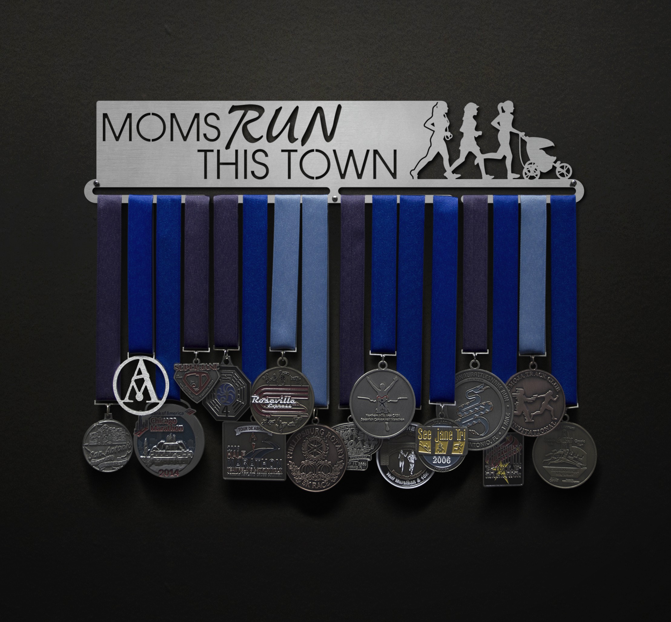 Moms Run This Town - 3 runners w/ stroller - negative letters