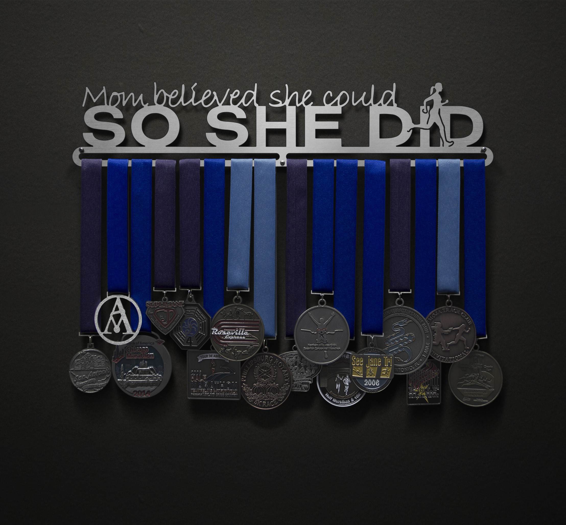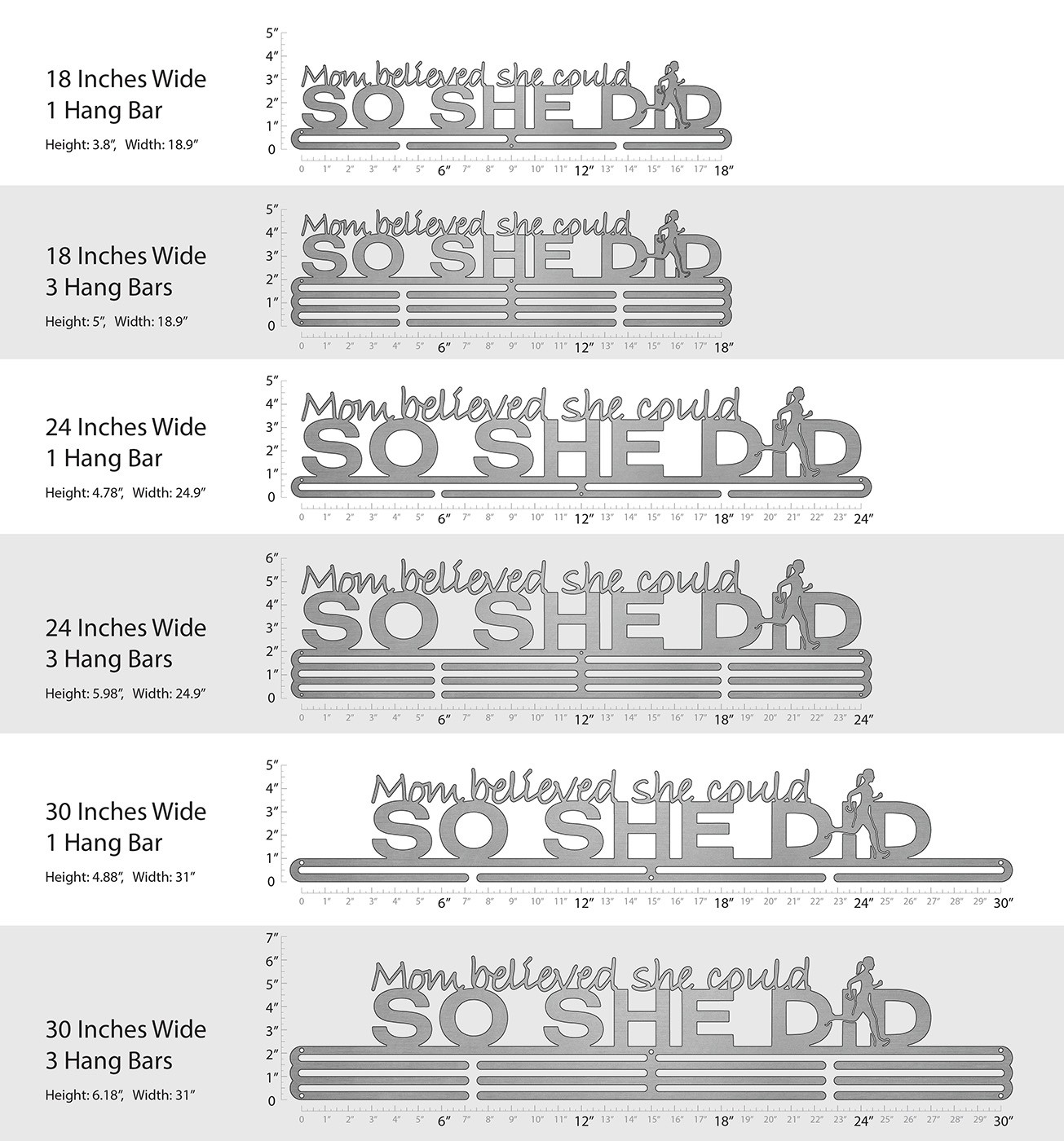 Unsure what size to get? We have created two consistently scaled images to show you what different sized displays look like when filled with medals.