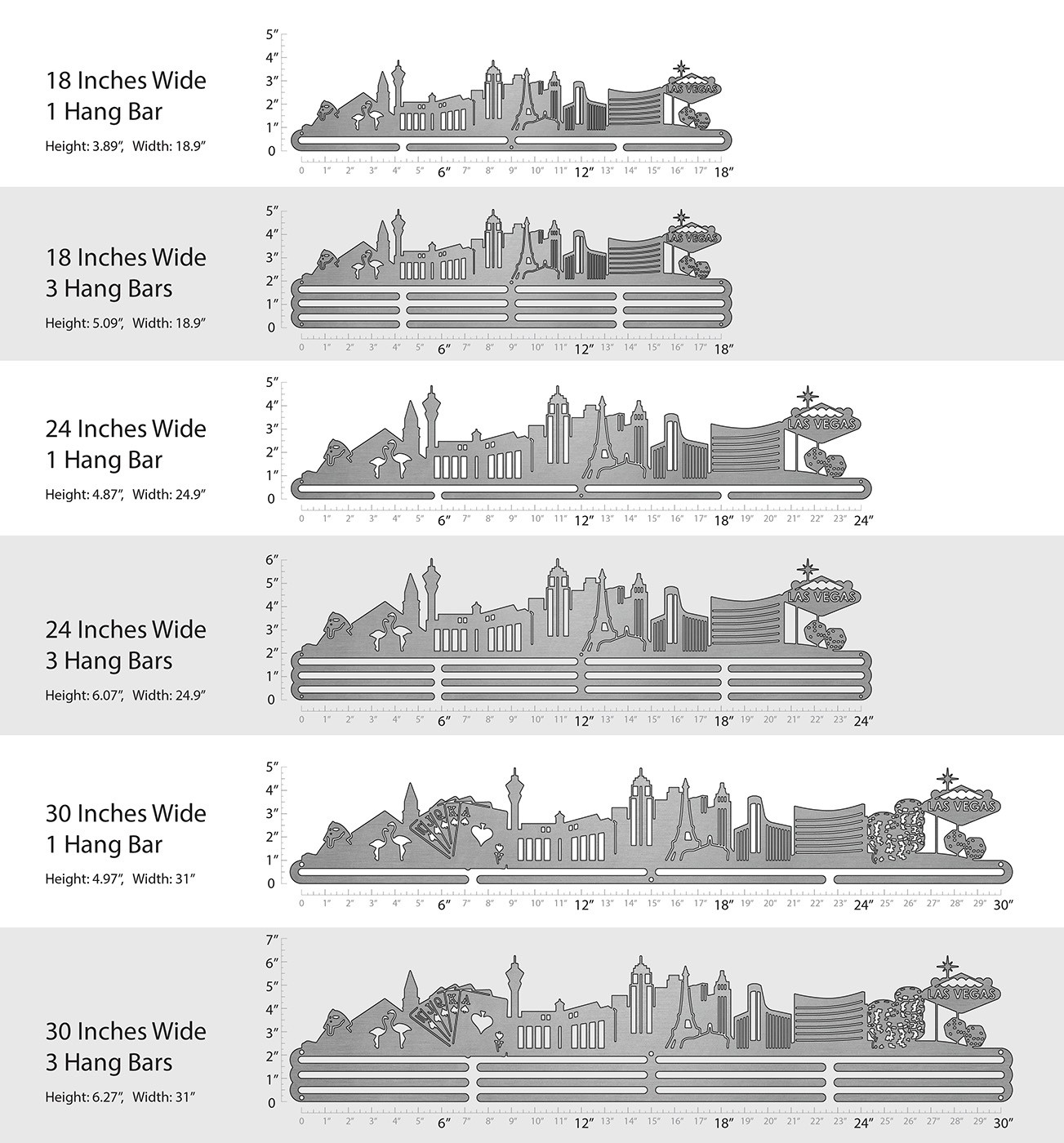 Unsure what size to get? We have created two consistently scaled images to show you what different sized displays look like when filled with medals.