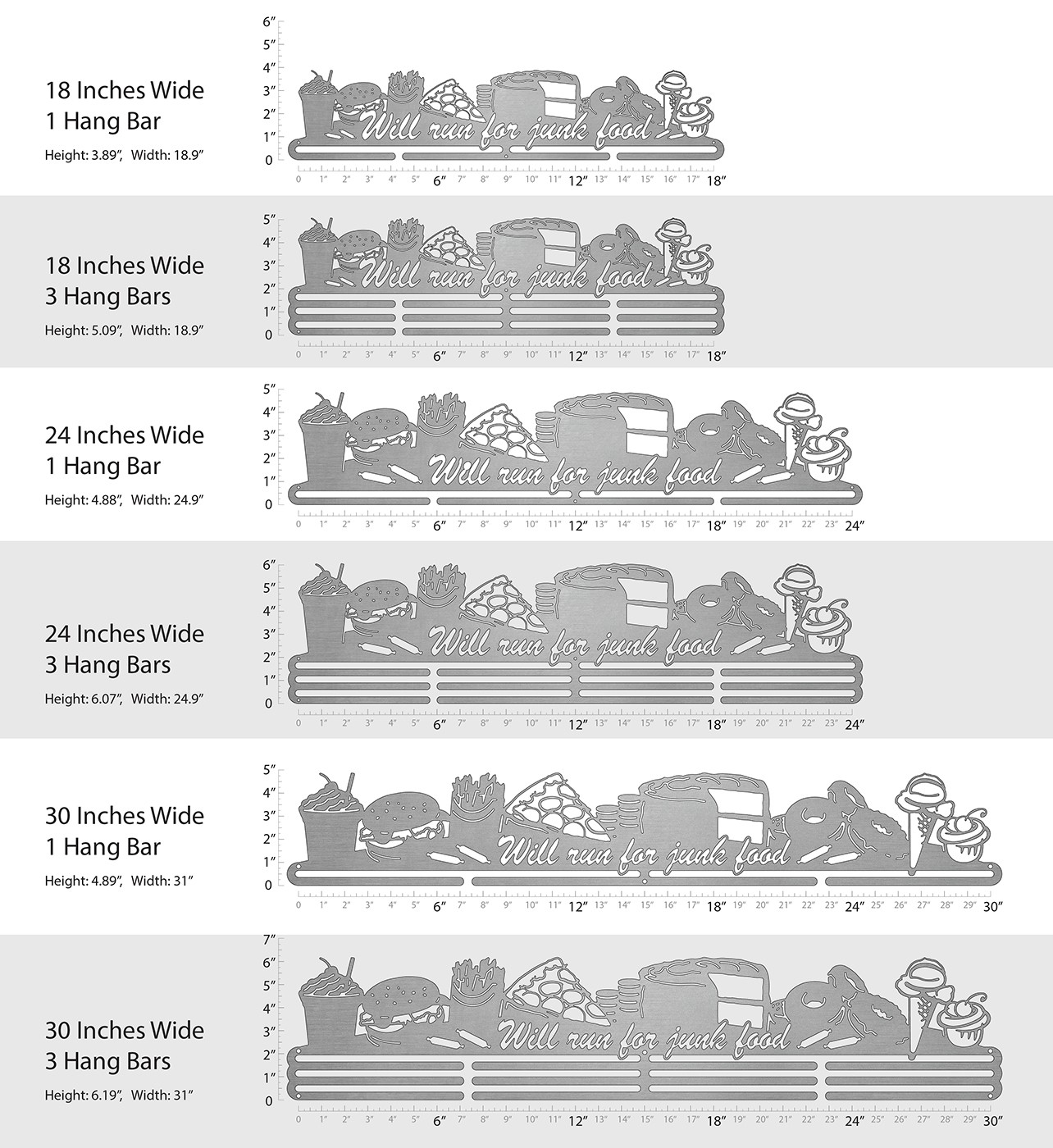 Unsure what size to get? We have created two consistently scaled images to show you what different sized displays look like when filled with medals.