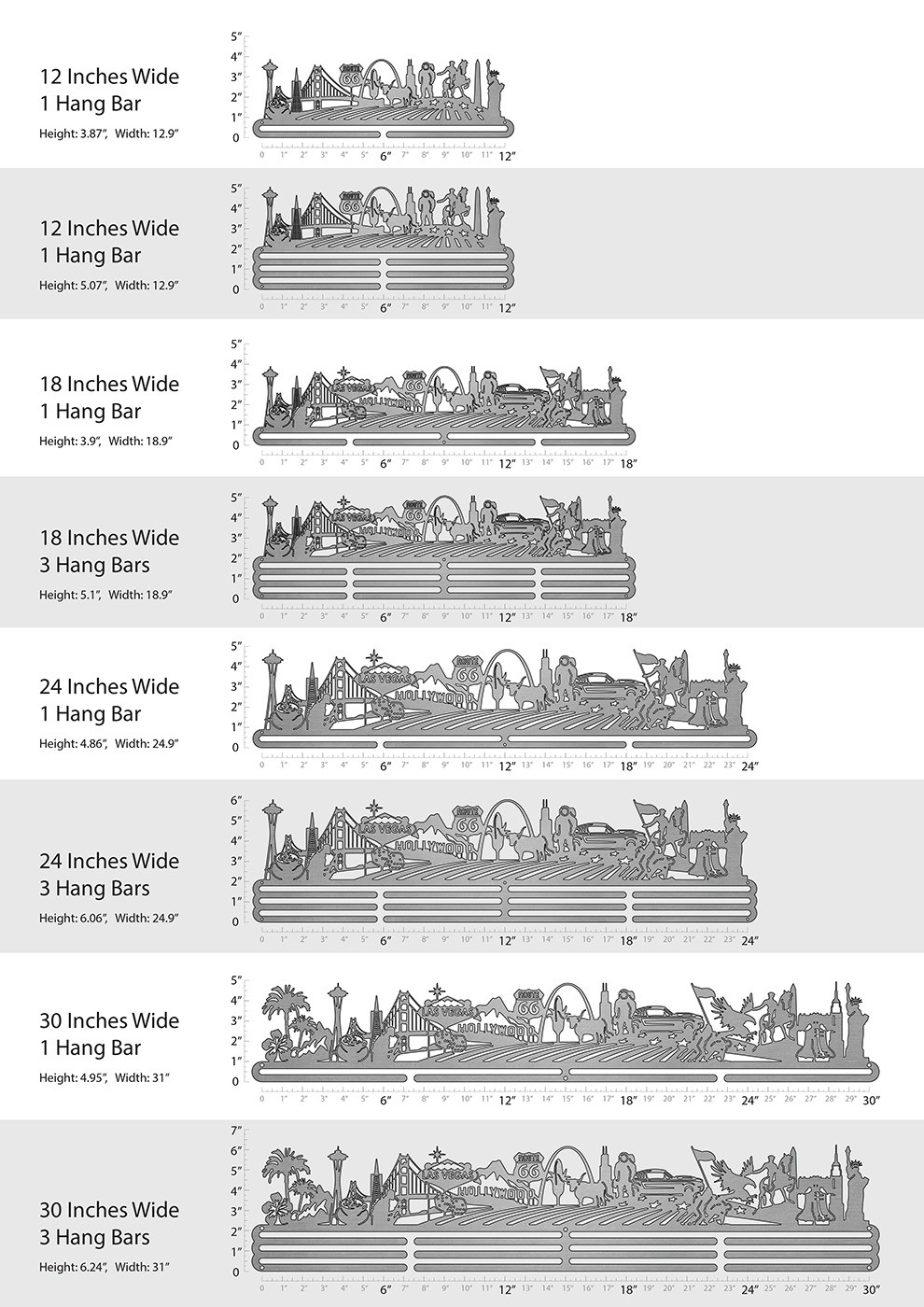 Unsure what size to get? We have created two consistently scaled images to show you what different sized displays look like when filled with medals.