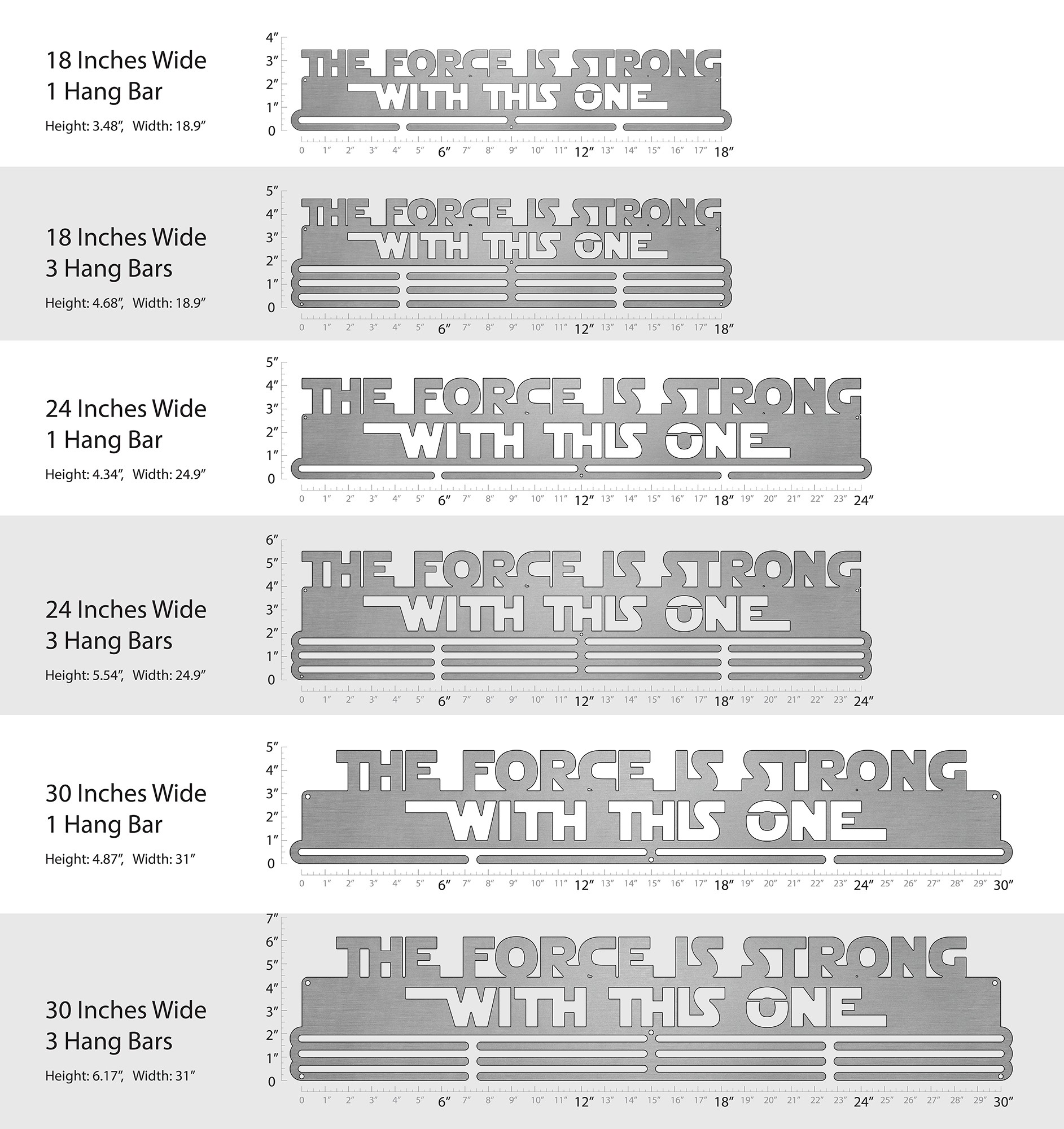 Unsure what size to get? We have created two consistently scaled images to show you what different sized displays look like when filled with medals.