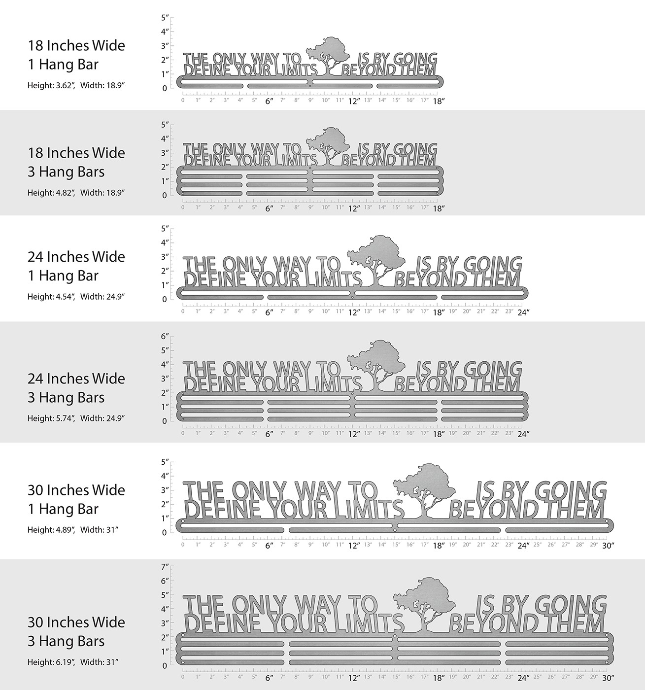 Unsure what size to get? We have created two consistently scaled images to show you what different sized displays look like when filled with medals.
