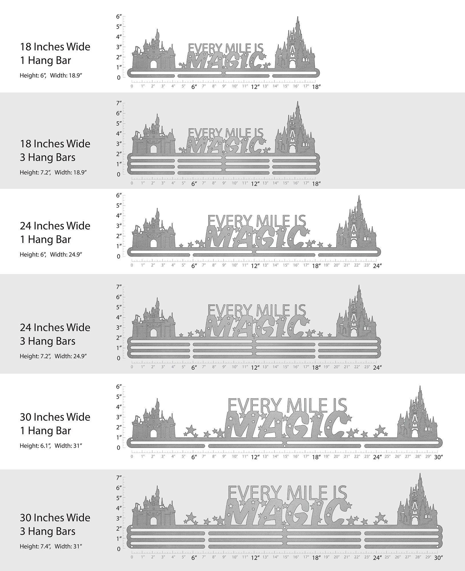 Unsure what size to get? We have created two consistently scaled images to show you what different sized displays look like when filled with medals.