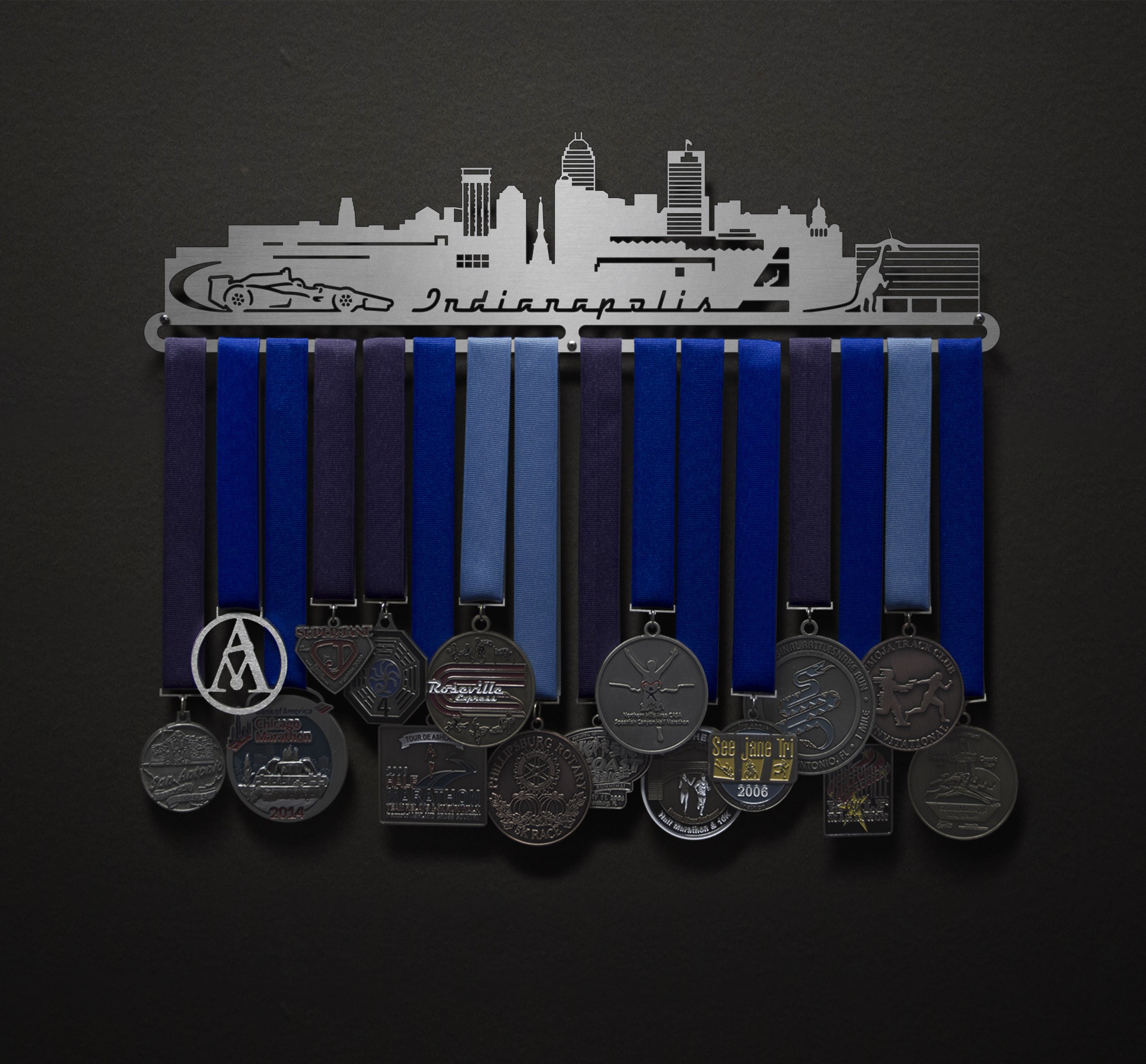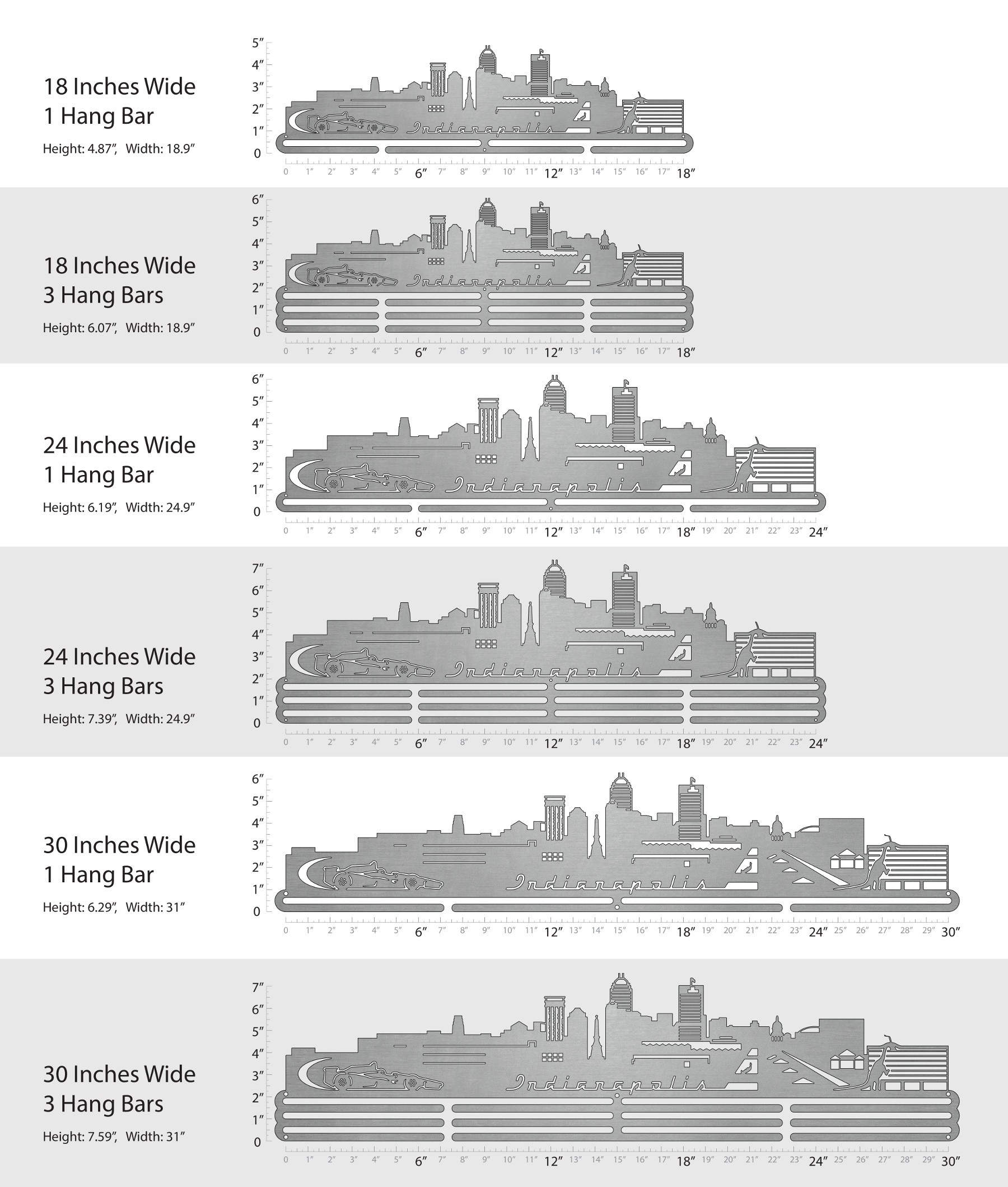 Unsure what size to get? We have created two consistently scaled images to show you what different sized displays look like when filled with medals.