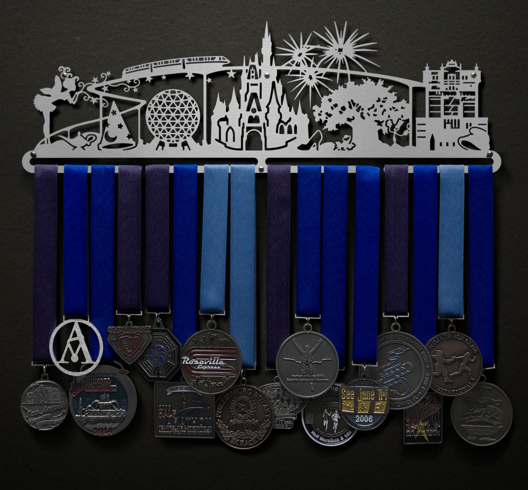 A fan-favorite for years, the iconic Magic World design is a reminder of the magical path you have taken throughout your running journey. With over 200 different laser piercings required to produce one, this is the most-complicated display we offer as a standard design. Each one takes around 10 minutes just to cut! Luckily we let the laser do most of the heavy lifting, you just need to provide the magical medals for a match made in heaven.