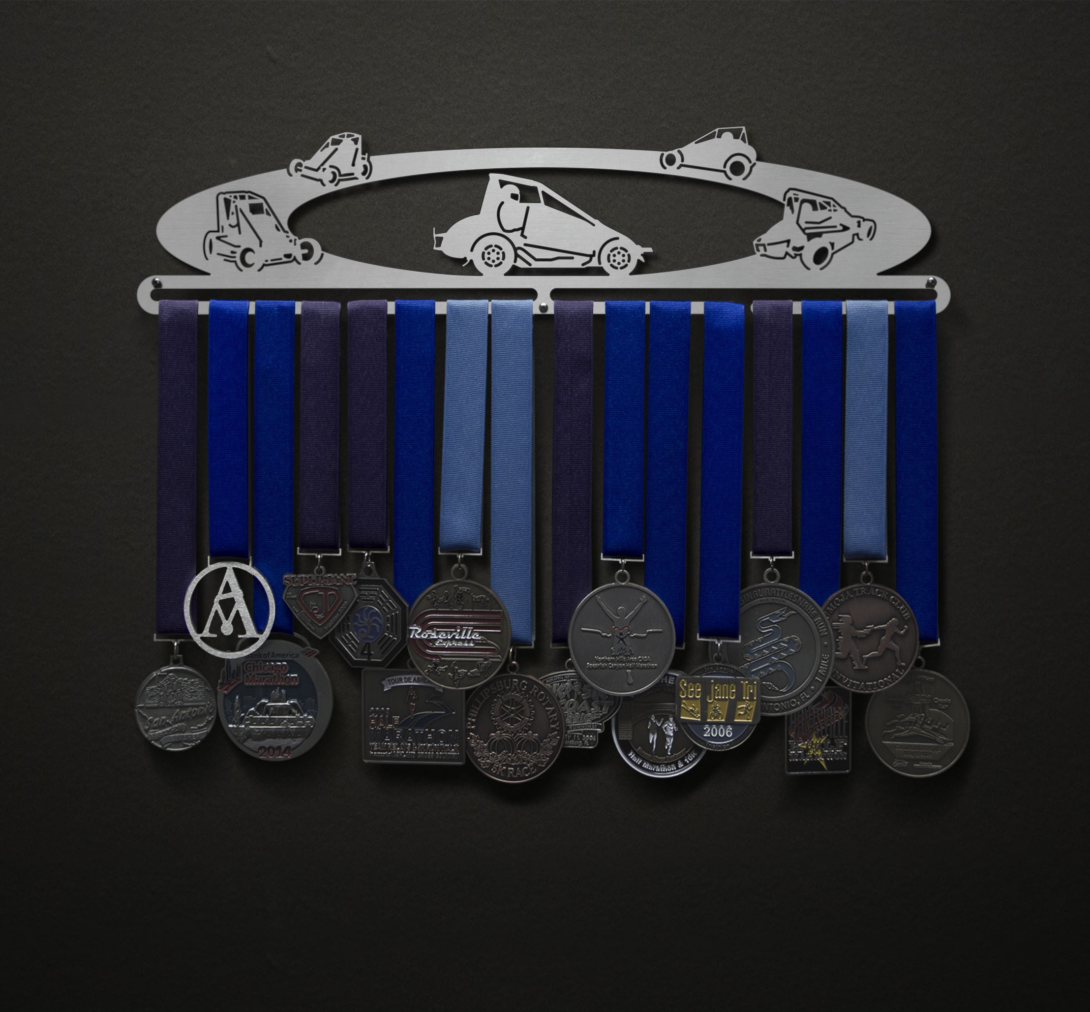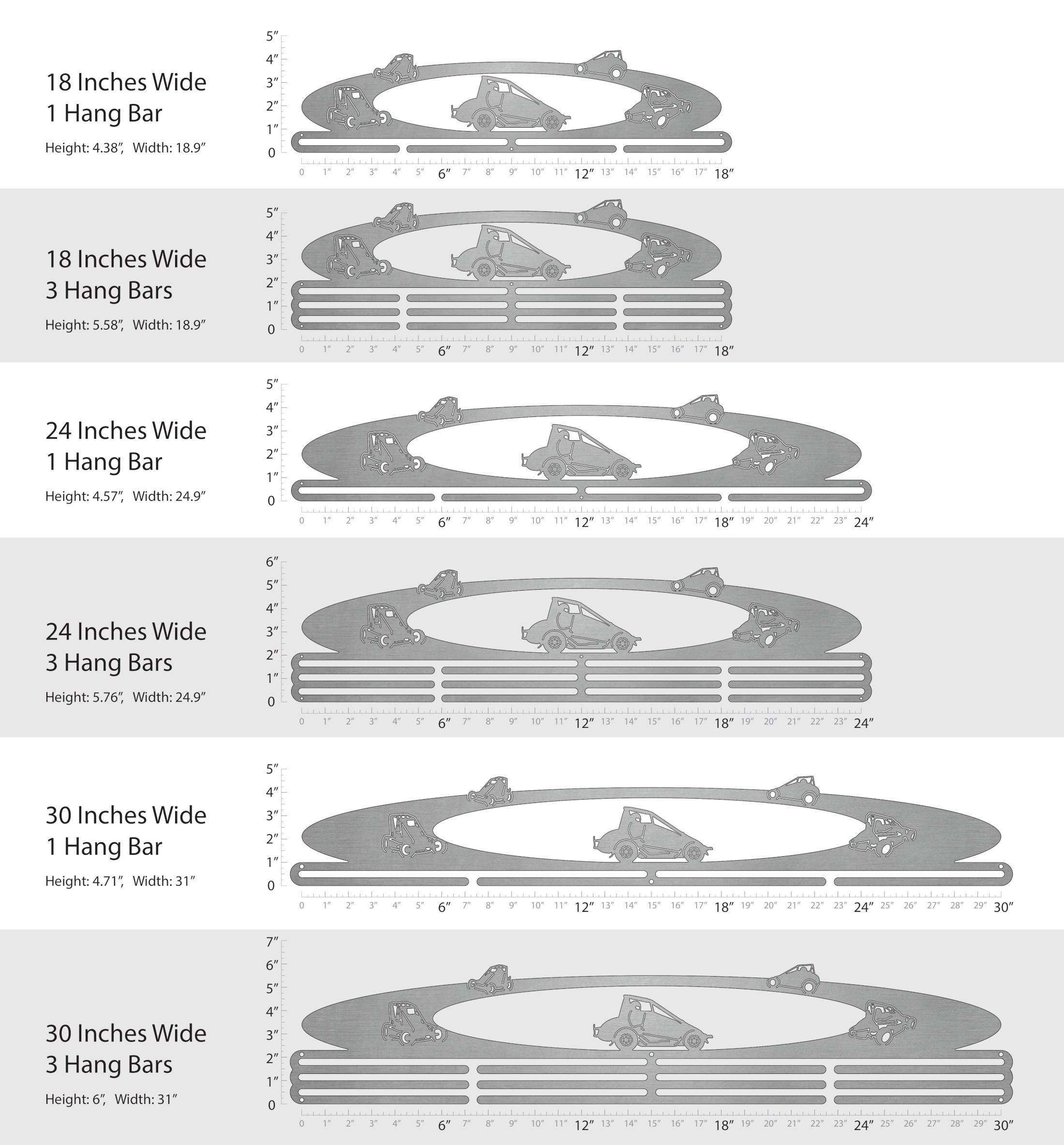 Unsure what size to get? We have created two consistently scaled images to show you what different sized displays look like when filled with medals.