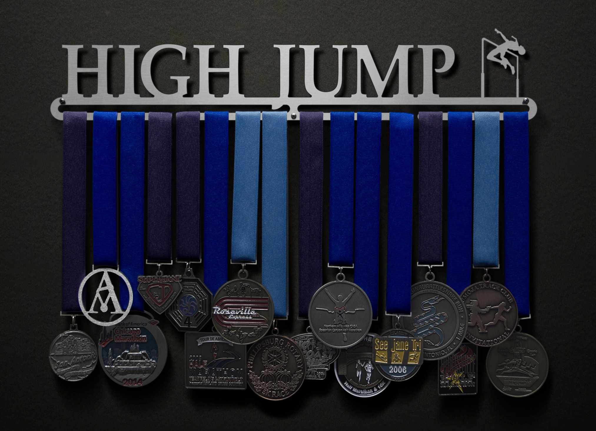 You worked so hard for the medal, just to throw it into a drawer?! Not anymore! Take yourself to new heights with this High Jump medal hanger! Every time you walk (or jump..) by this medal hanger you will be reminded of all your hard work and dedication that got you this far, which will keep you focused and give you the extra motivation you need to keep moving forward!